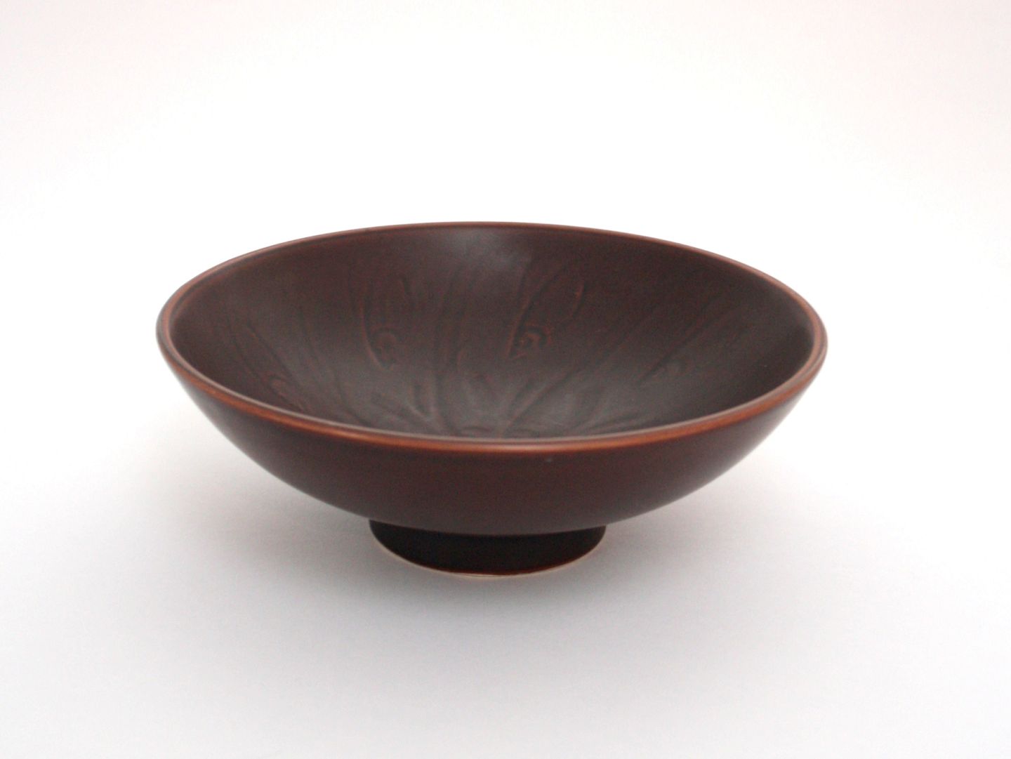 Aluminia, Solbjerg kunststengods fra 1934 designet af Nils Thorsson. Rødbrun skål med fisk indridset i selve originalformen. Glasuren er mat. Formnr. 1585. Diameter 18 cm. Højde 6,3 cm. Pris: 350 kr. stk. Lager: 1