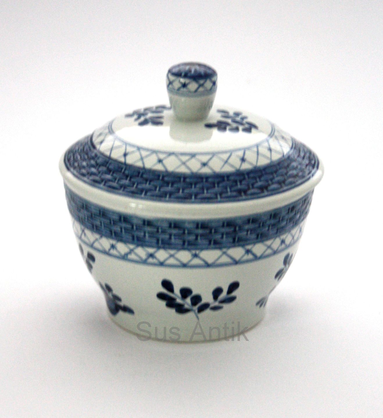 Sukkerskål med låg. Nr. 11/963. Højde 10 cm. Diameter 10 cm. God stand med mikroskopisk chip på inderside af låg. Pris: 275 kr.