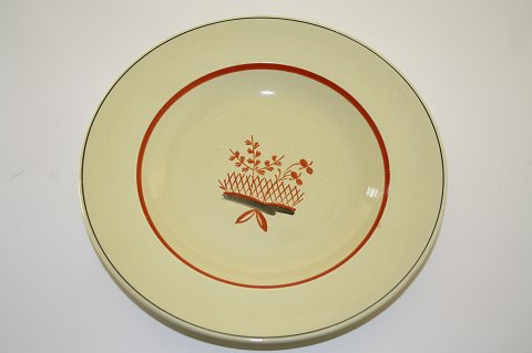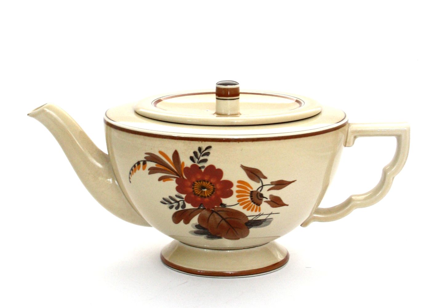 Aluminia fajance. Knud. Design Niels Thorsson. Håndmalet. Produceret i perioden 1934-1963. Tekande med låg. Højde 12 cm. Diameter 15,5 cm. Længde 25,5 cm. Lettere overfladekrakelering udvendig. Brun krakelering indvendig. Lille glasurafslag under tuden yderst. Pris: SOLGT