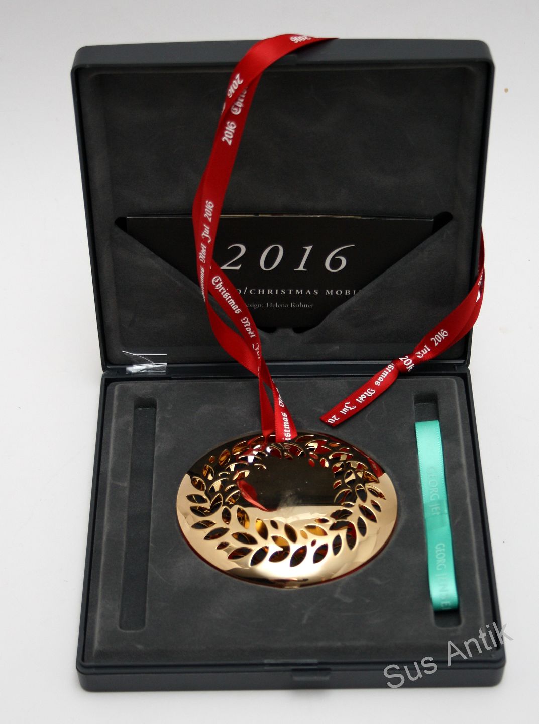 Georg Jensen, Juleuro 2016 Magnolia krans designet af kunstner Helena Rohner. Juleuroen er udført i messing belagt med 24 karat guld. Originalt rødt og turkis silkebånd og gaveæske medfølger. Pæn og velholdt stand. Pris: 475 kr. stk. Lager: 1