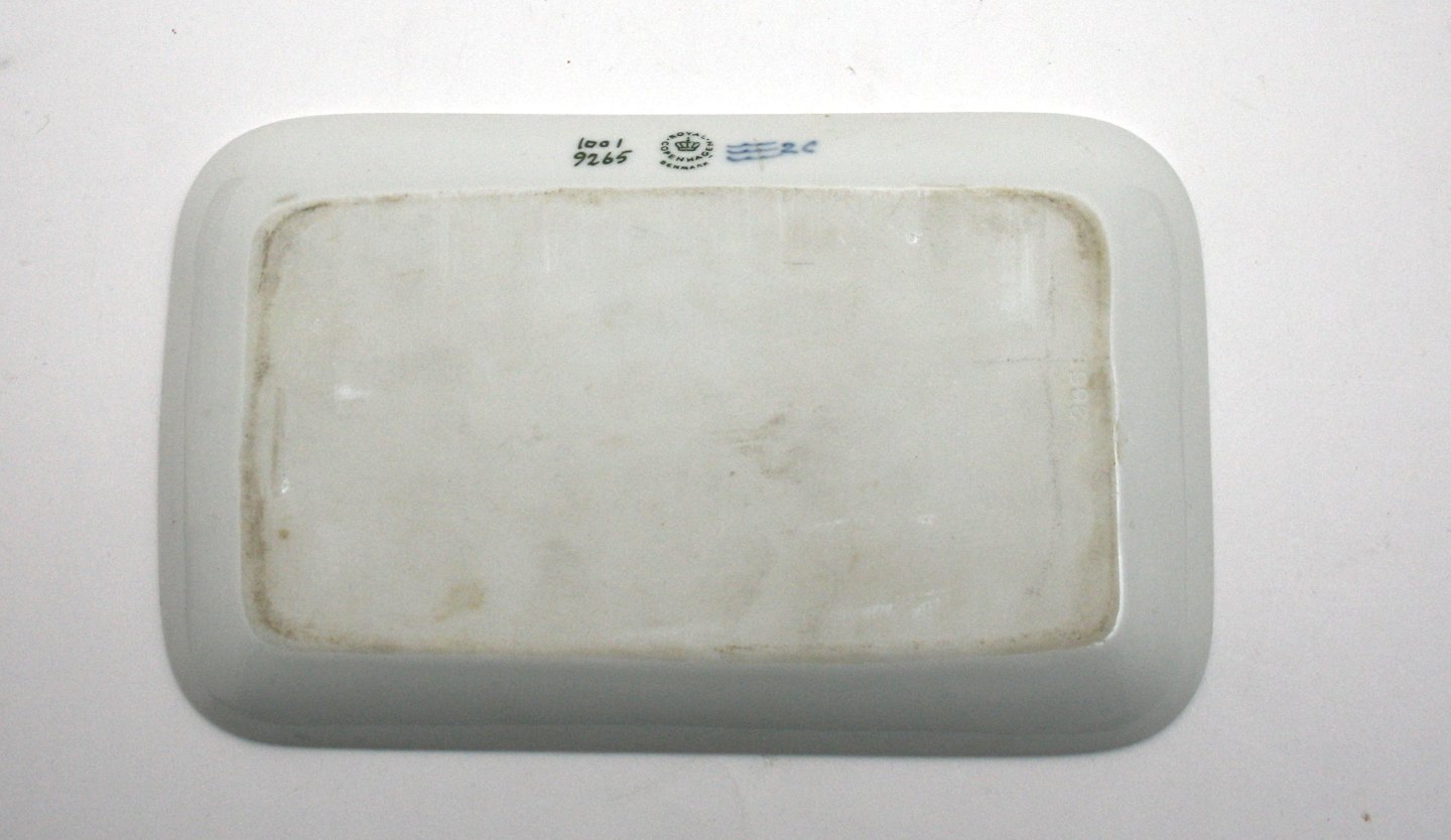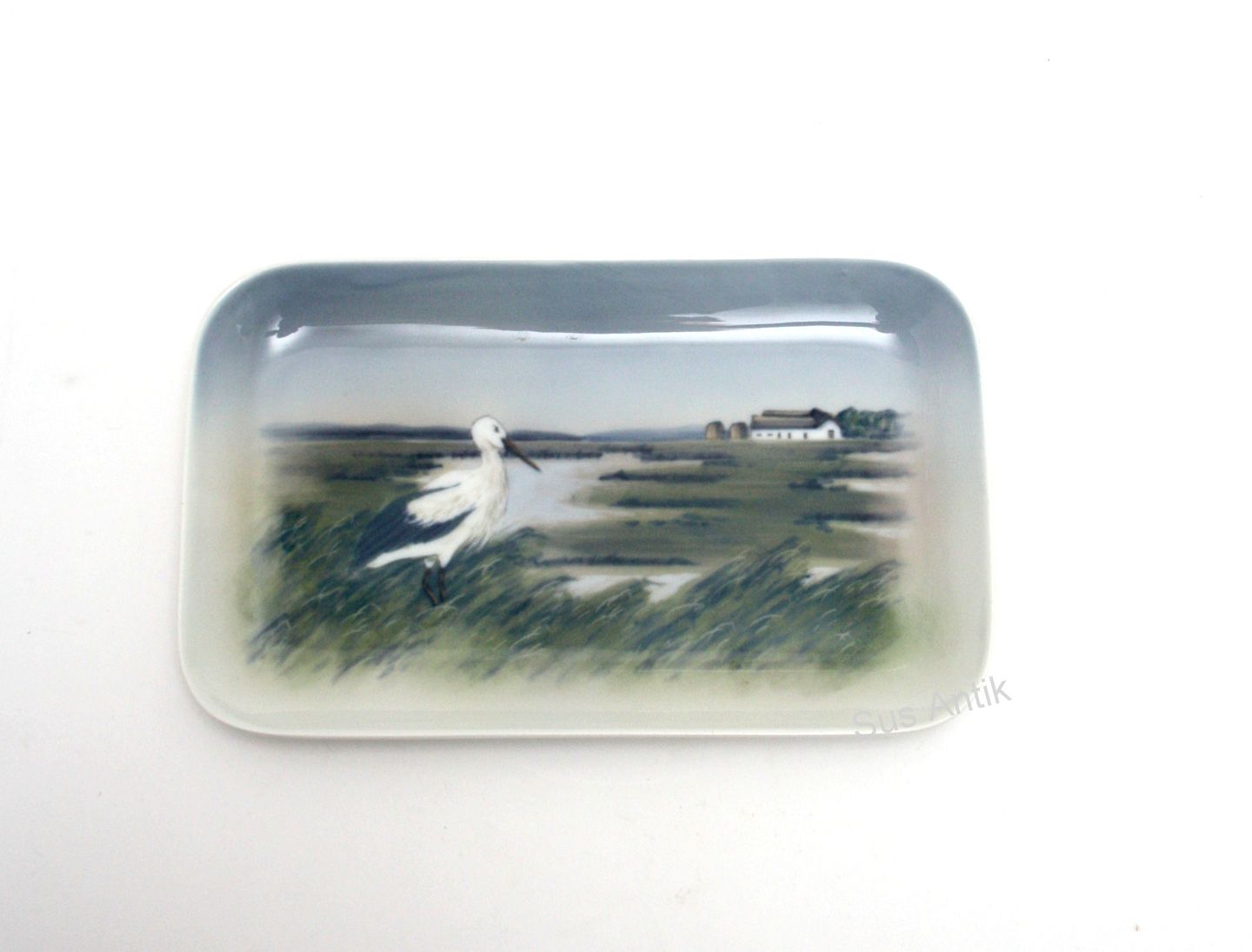 Royal Copenhagen, Aflangt fad med stork og landskab. Nr. 1001/9265. Længde 21 cm. Bredde 12,7 cm. II. sortering. Pris: 125 kr. stk. Lager: 1