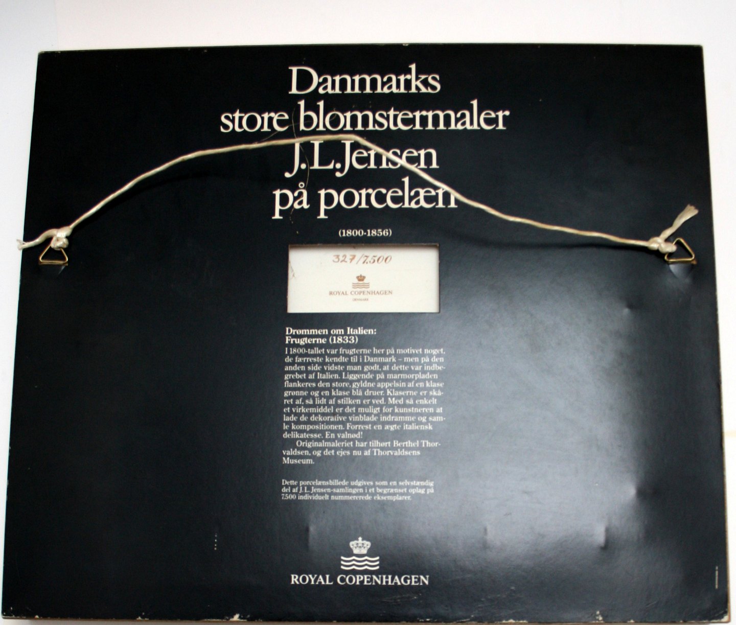 Royal Copenhagen porcelænsbillede i guldramme. Udgivet som en selvstændig del af J.L. Jensen samlingen i et begrænset oplag på 7.500 nummererede eksemplarer. Nr. 327/7.500. Rammen måler 39,5 x 33 cm. Fin stand. Pris: 1500 kr.