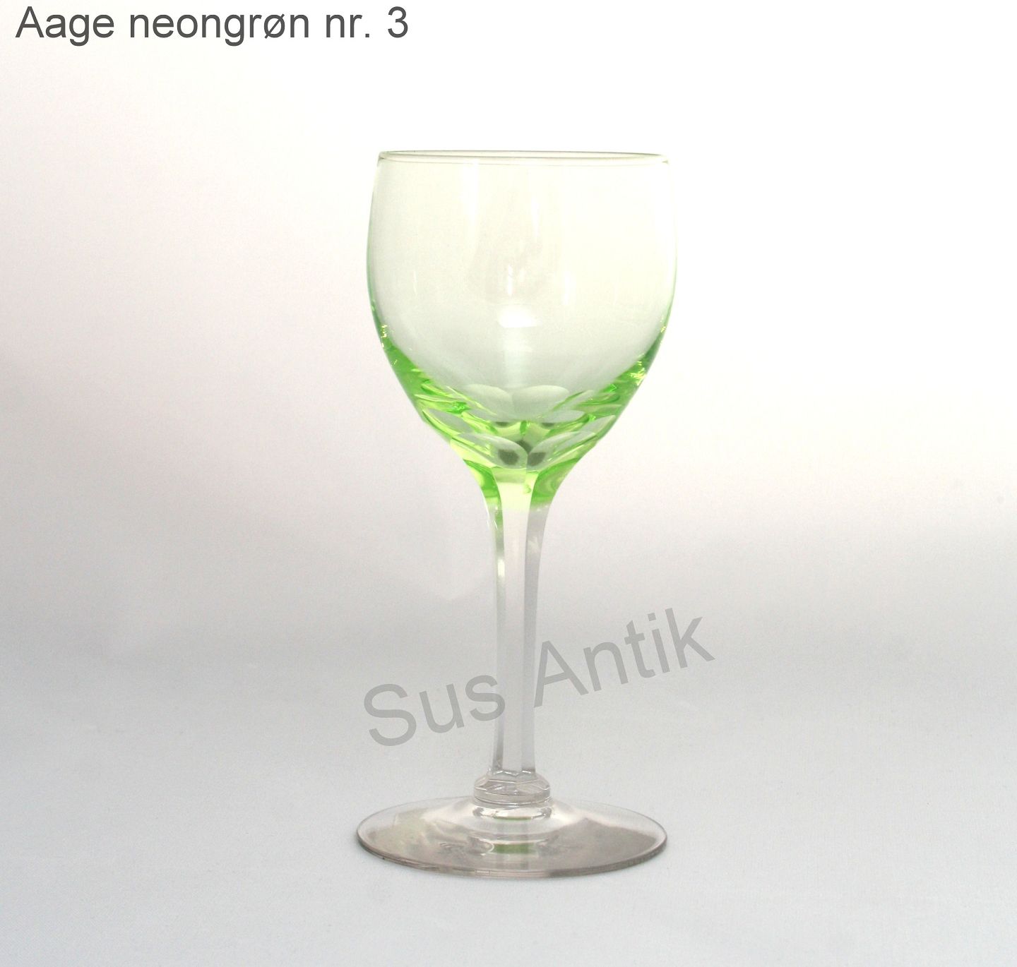 Aage glas, Holmegaard glasværk 1916-50. Hvidvin, neongrøn, højde 14,5 cm. Dette glas er nr. 3 på ekstra foto. Almindelig aldersrelateret brugsslid. Pris: 125 kr. stk. Lager: 3