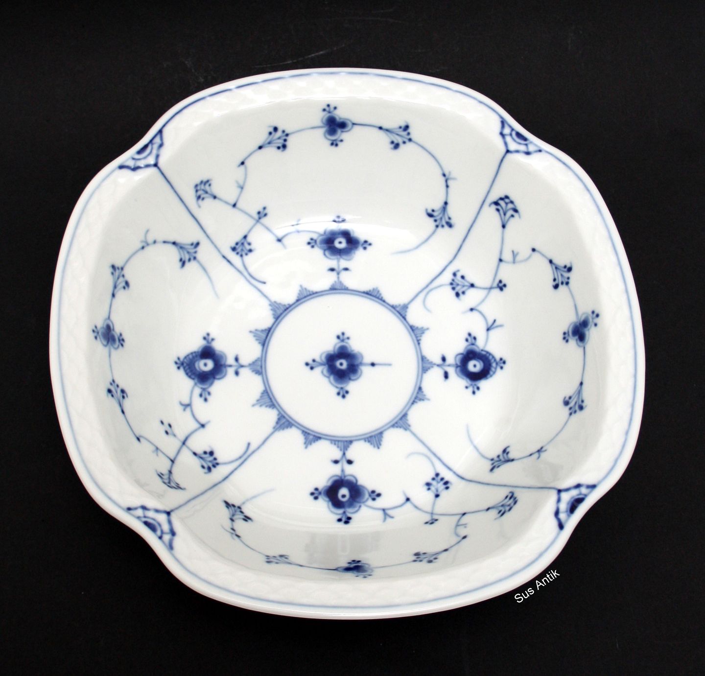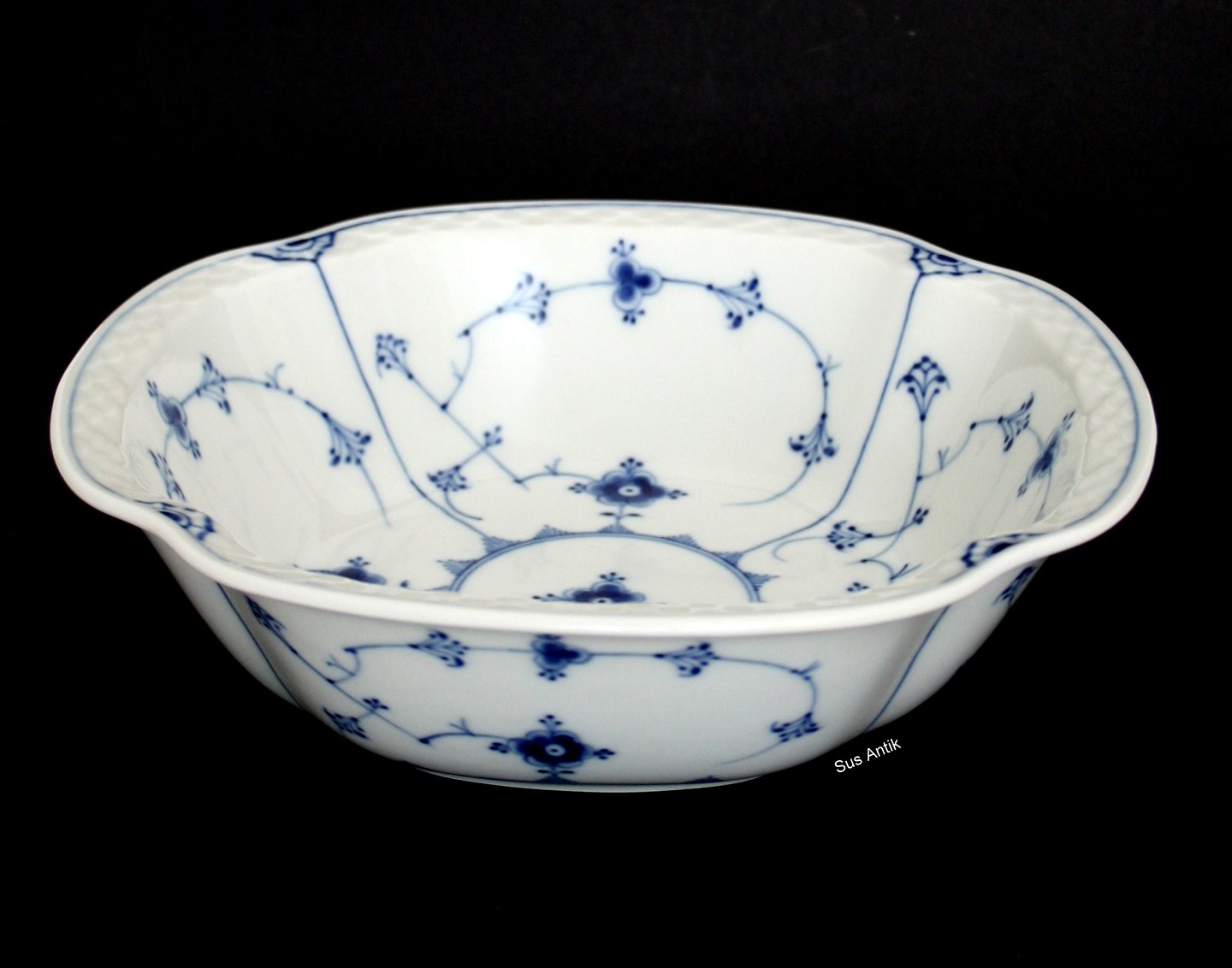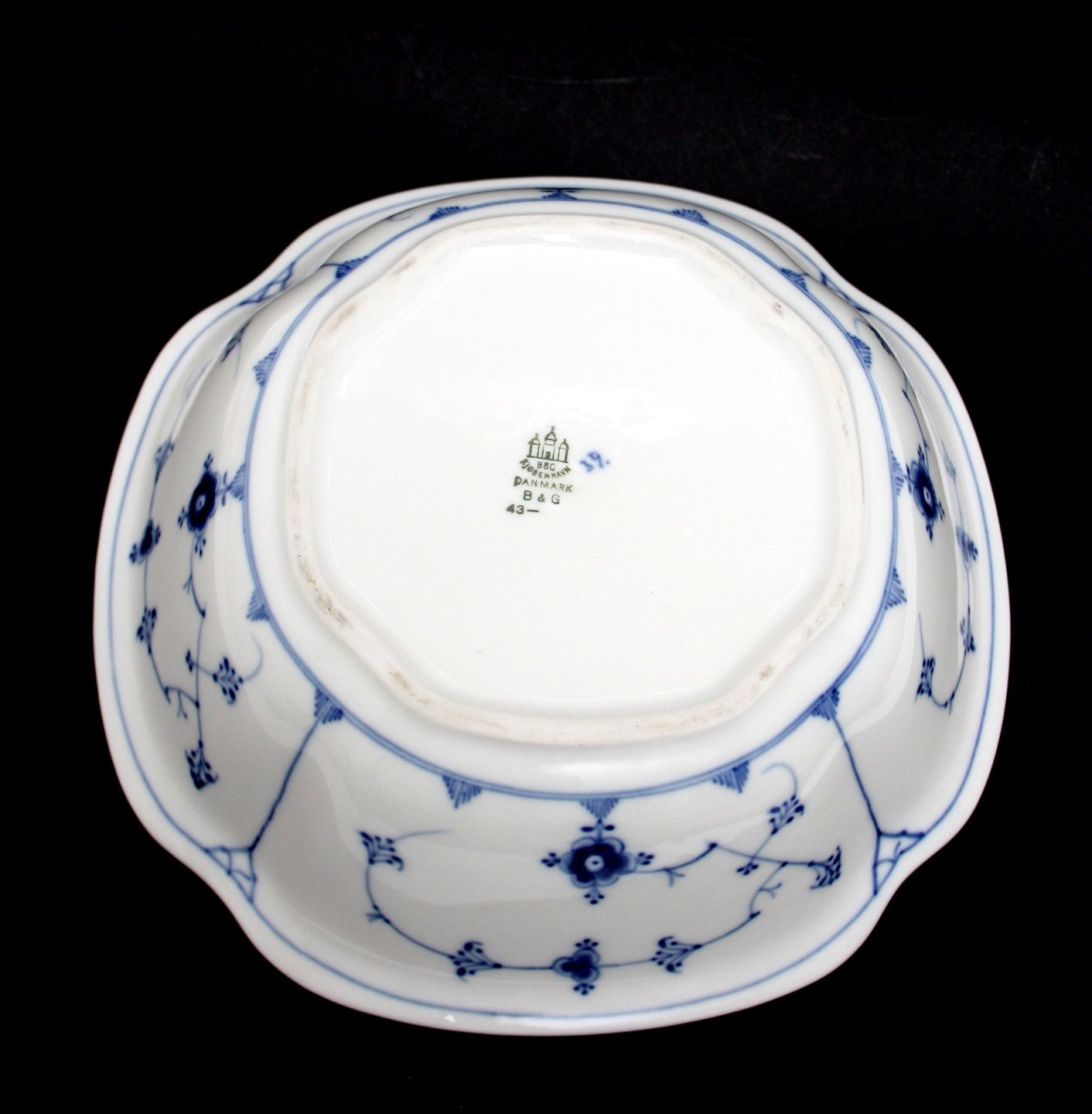 Bing og Grøndahl, Blåmalet (musselmalet). Kartoffelskål. Nr. 43. Produceret 1948-1952. Diameter 24,5 x 24,5 cm. Højde 7 cm. II. sortering. Enkelt brændingsplet fin stand. Pris: SOLGT