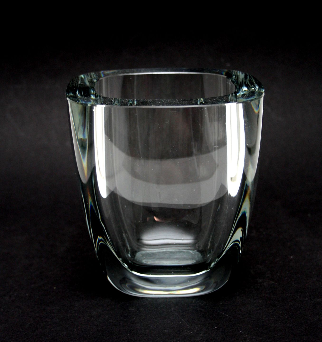 Strömbergshyttan, Sverige, Vase. Tungt kraftigt blåligt glas. Højde 13 cm. Længde 12 cm. Bredde 11 cm. Lettere overfladeridser. Pris: 375 kr.