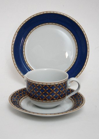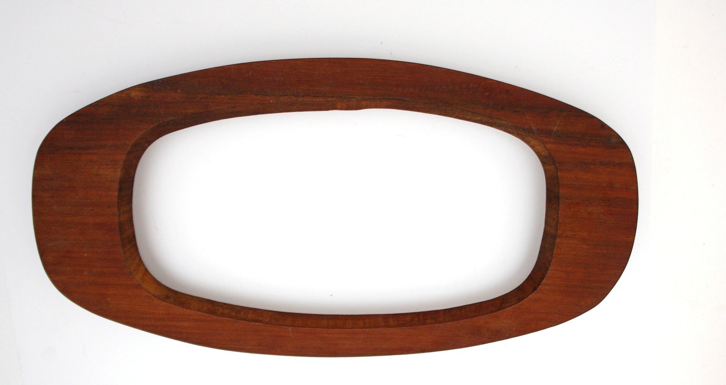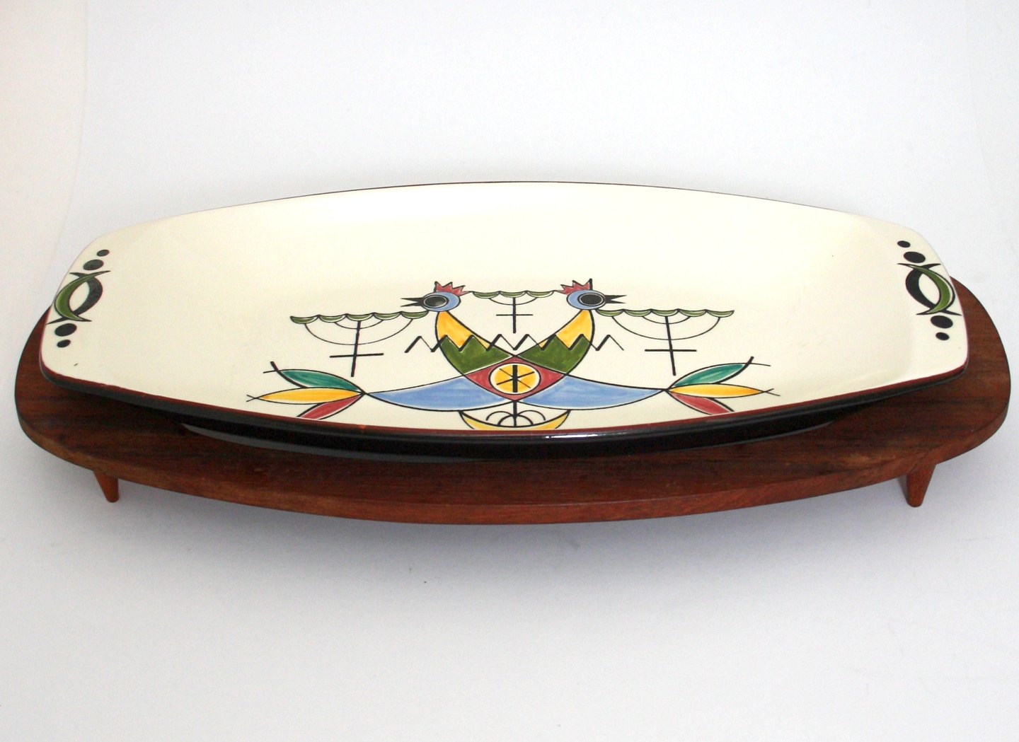Knabstrup, Symfoni designet af Piotr Baro, formgivet af Johannes Hansen. I produktion i perioden 1959-61. Aflangt fad med fuglemotiv på teak stativ.