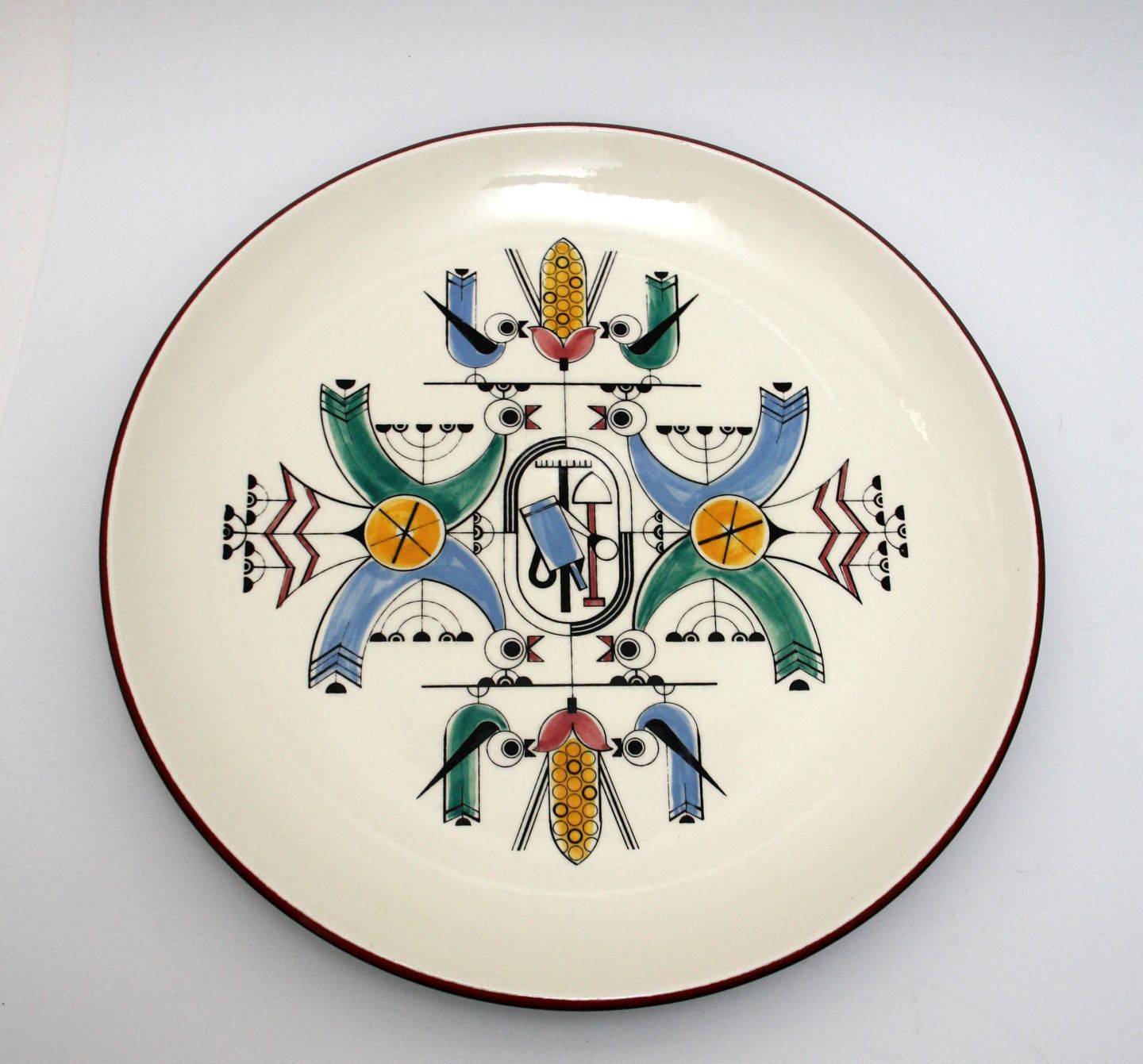 Knabstrup, Symfoni designet af Piotr Baro, formgivet af Johannes Hansen. I produktion i perioden 1959-61. Stort rundt fad med fuglemotiv. Diameter 31 cm. Let overfladekrakelering, kantafslag bagpå. Pris: SOLGT
