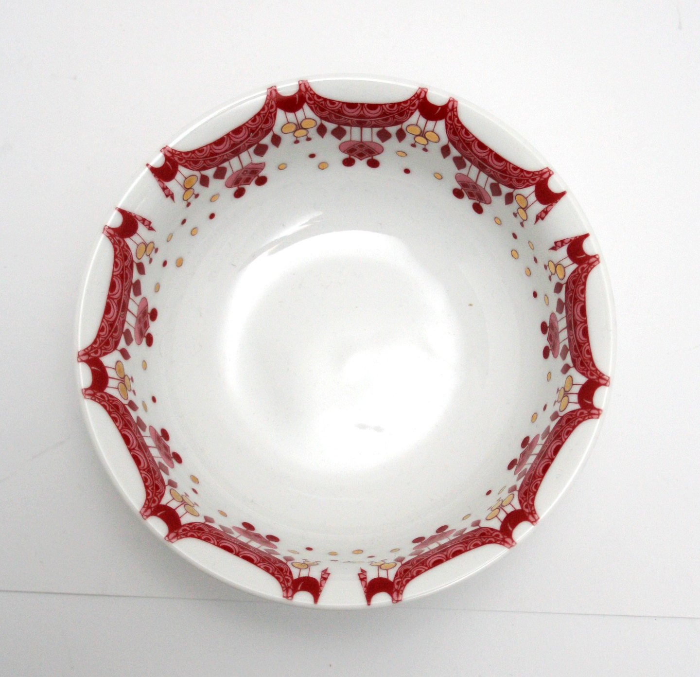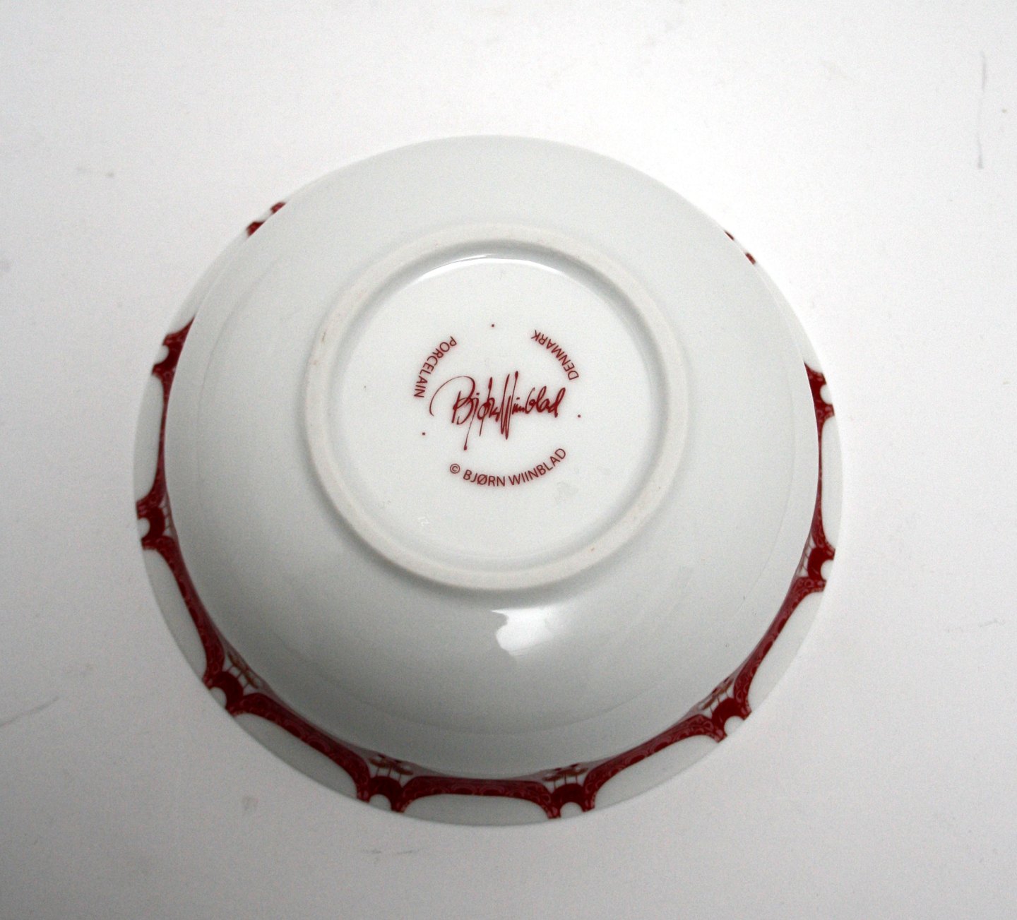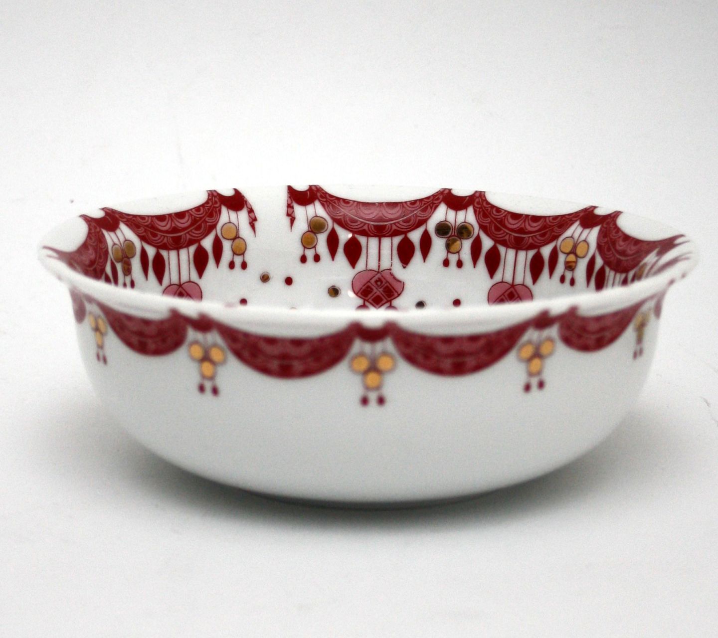 Bjørn Wiinblad, Juleskål med guirlander og hjerter i rød. Højde 5,5 cm. Diameter 16 cm. Pris: 150 kr.
