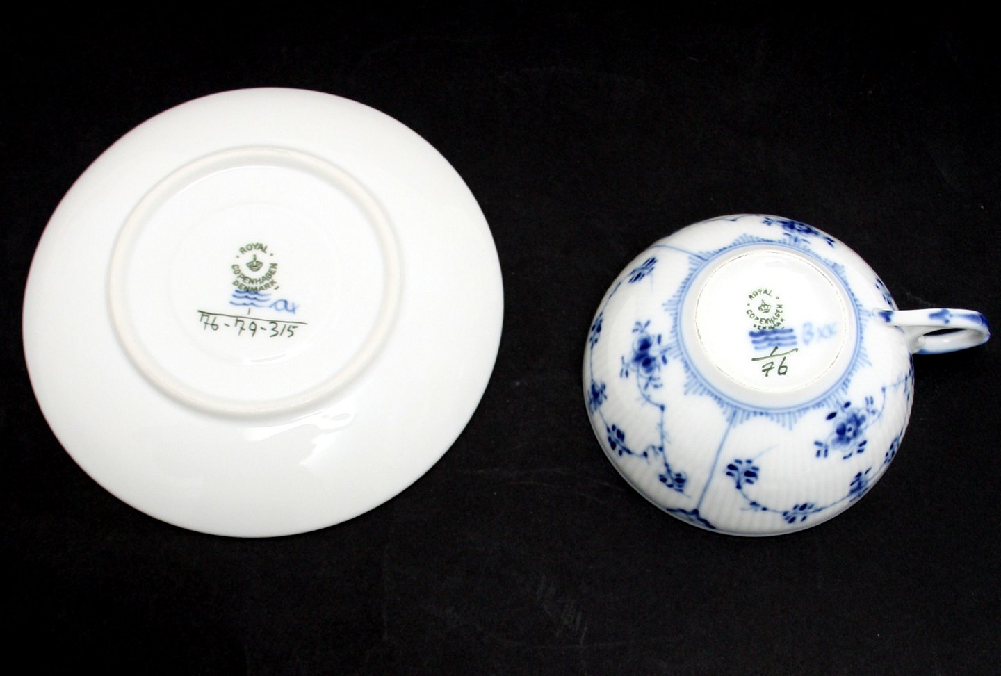 Royal Copenhagen, Musselmalet riflet. Tekop. Nr. 1-76. Diameter 10 cm. Højde 4,5 cm. Underkop diameter 14,5 cm.