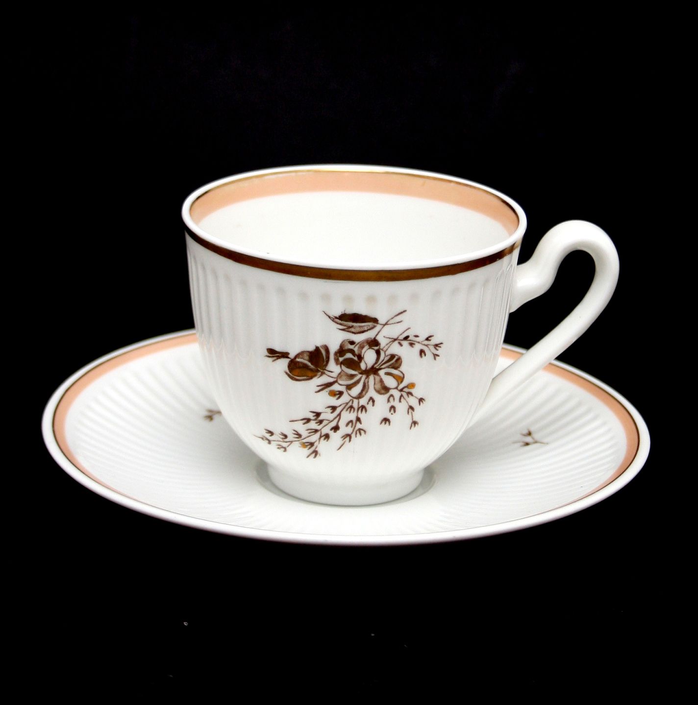 Royal Copenhagen, Clarissa. Designet af Thorkild Olsen i 1950'erne. Hvidt riflet stel med guld- og rosa/beige kanter, samt blomstermotiv i guld. Kaffekop. Nr. 1510/9956. Højde 6,4 cm. Diameter 7,5 cm. Underkop diameter 13,5 cm. II. sortering. Fin stand. Pris: 40 kr. pr. par Lager: 11