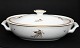 Royal Copenhagen, Clarissa. Designet af Thorkild Olsen i 1950'erne. Hvidt riflet stel med guld- og rosa/beige kanter, samt blomstermotiv i guld. Terrin, lågfad. Nr. 1510/14052. Længde 29,5 cm. Bredde 18 cm. Højde 10,5 cm. II. sortering. Fin stand. Pris: 475 kr. stk. Lager: 1