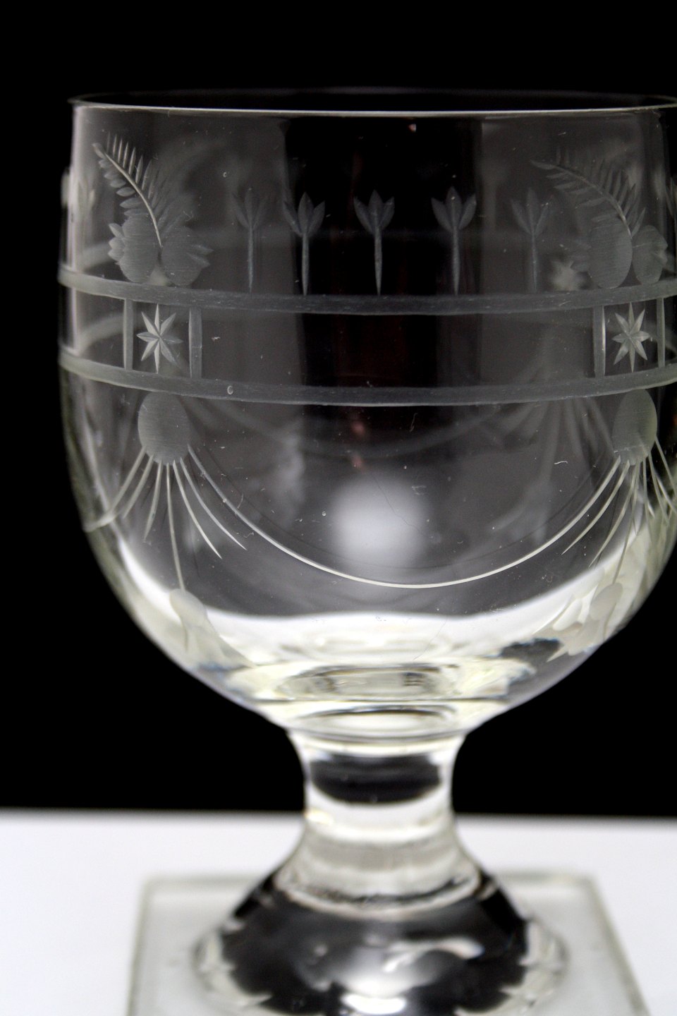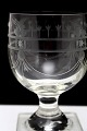 Glas med rund kumme og slebne motiver og kraftig firkantet slebet fod. Bunden har opstukket "blomst" med runde kronblade. Enkelte med mindre afslag på fod.