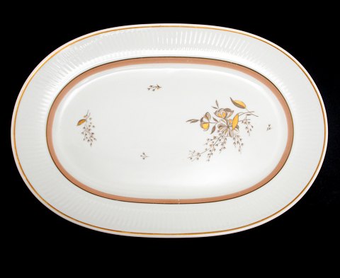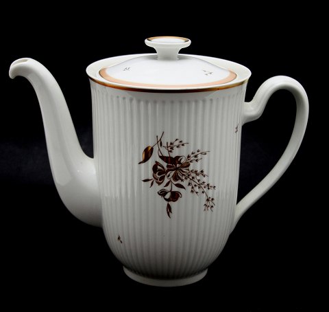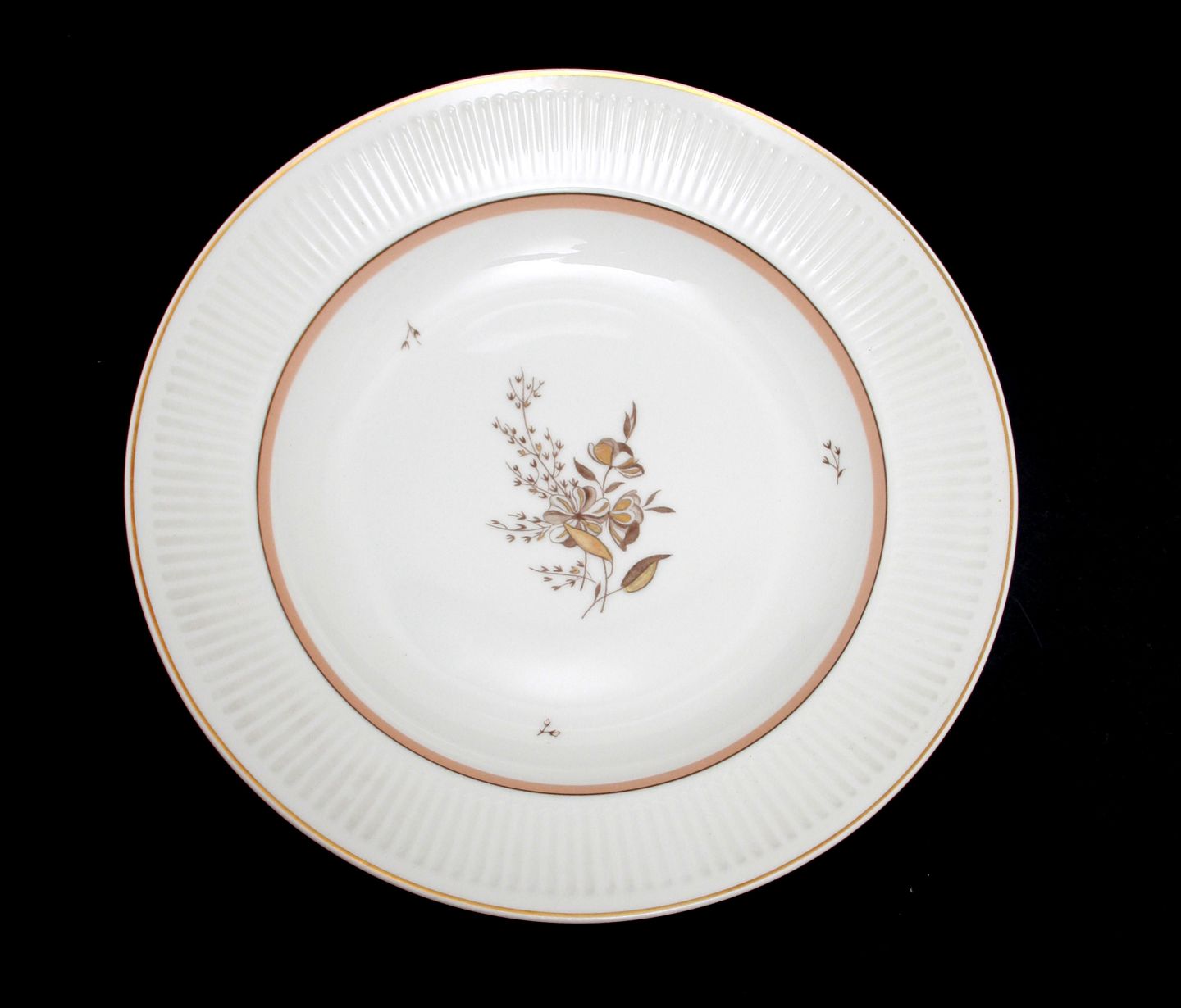 Royal Copenhagen, Clarissa. Designet af Thorkild Olsen i 1950'erne. Hvidt riflet stel med guld- og rosa/beige kanter, samt blomstermotiv i guld. Middagstallerken, dyb. Nr. 1510/14059. Diameter 24,5 cm. II. sortering. Fin stand. Pris: 85 kr. stk. Lager: 12