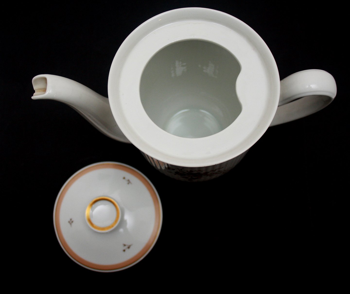 Royal Copenhagen, Clarissa. Designet af Thorkild Olsen i 1950'erne. Hvidt riflet stel med guld- og rosa/beige kanter, samt blomstermotiv i guld. Kaffekande. Nr. 1510/9949. Højde 20 cm. Længde 24 cm. II. sortering. Fin stand. Pris: 225 kr. stk. Lager: 1