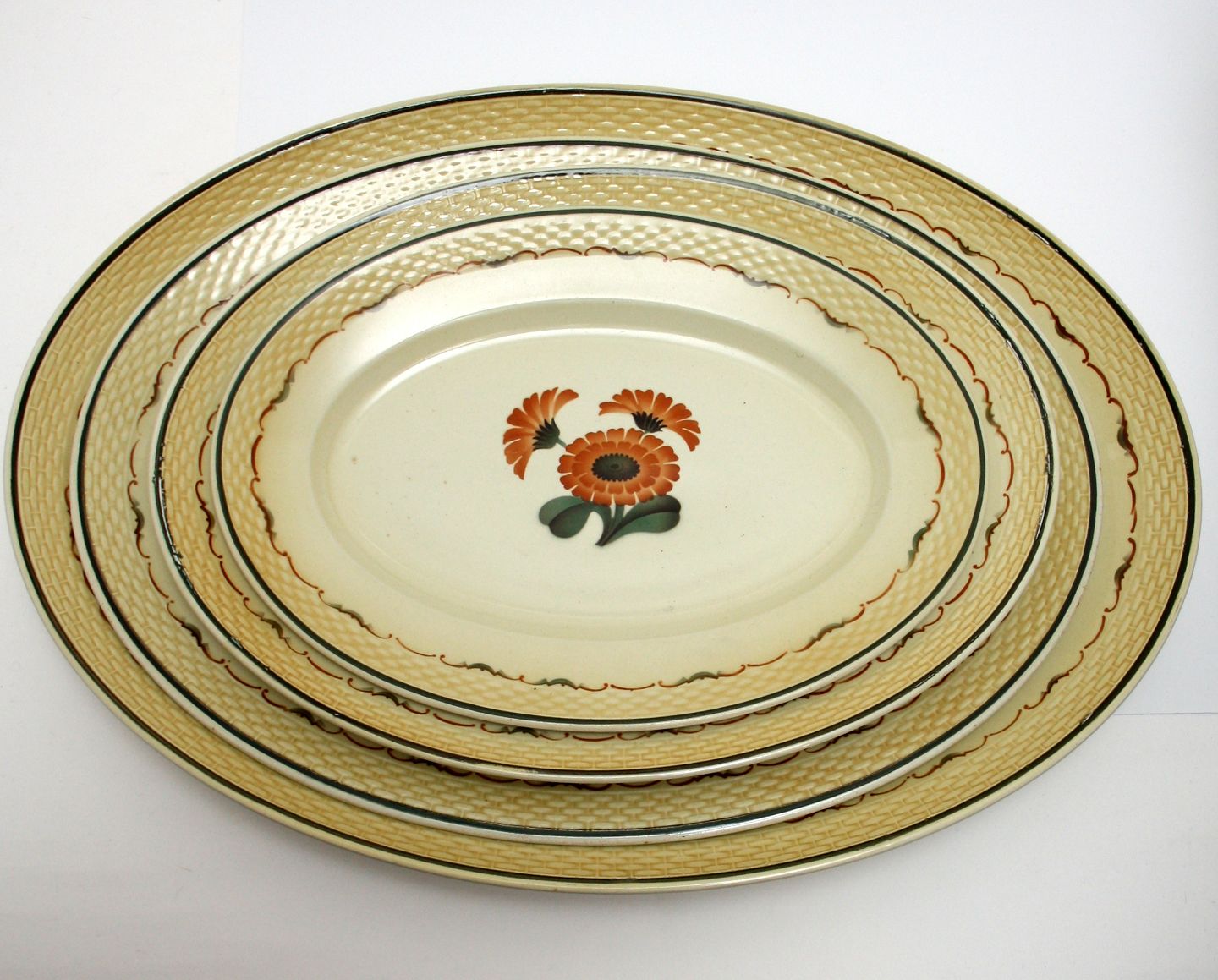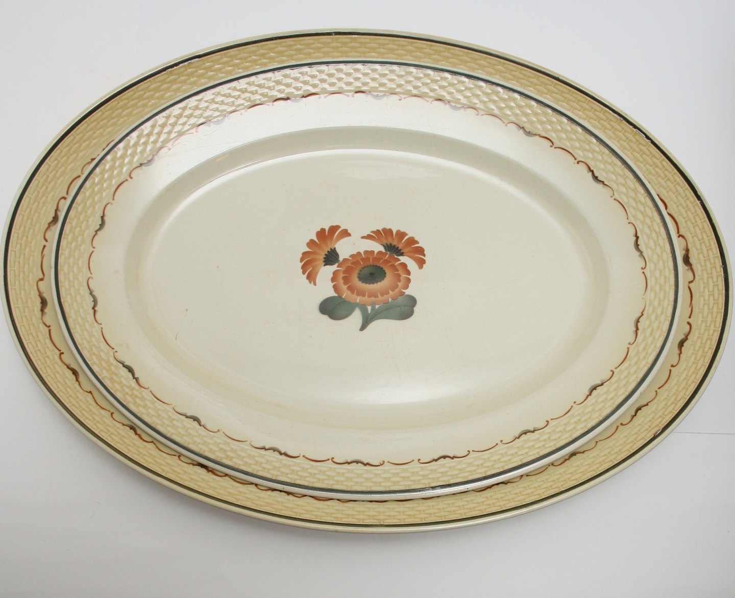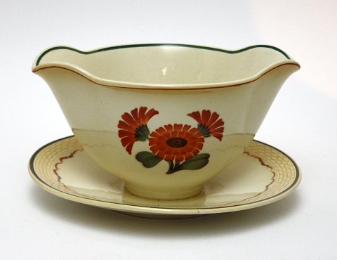 Aluminia, Morgenfrue. Designet af Niels Thorsson. Produceret i perioden 1934-1967. Ovale fade. Almindeligt brugsslid.