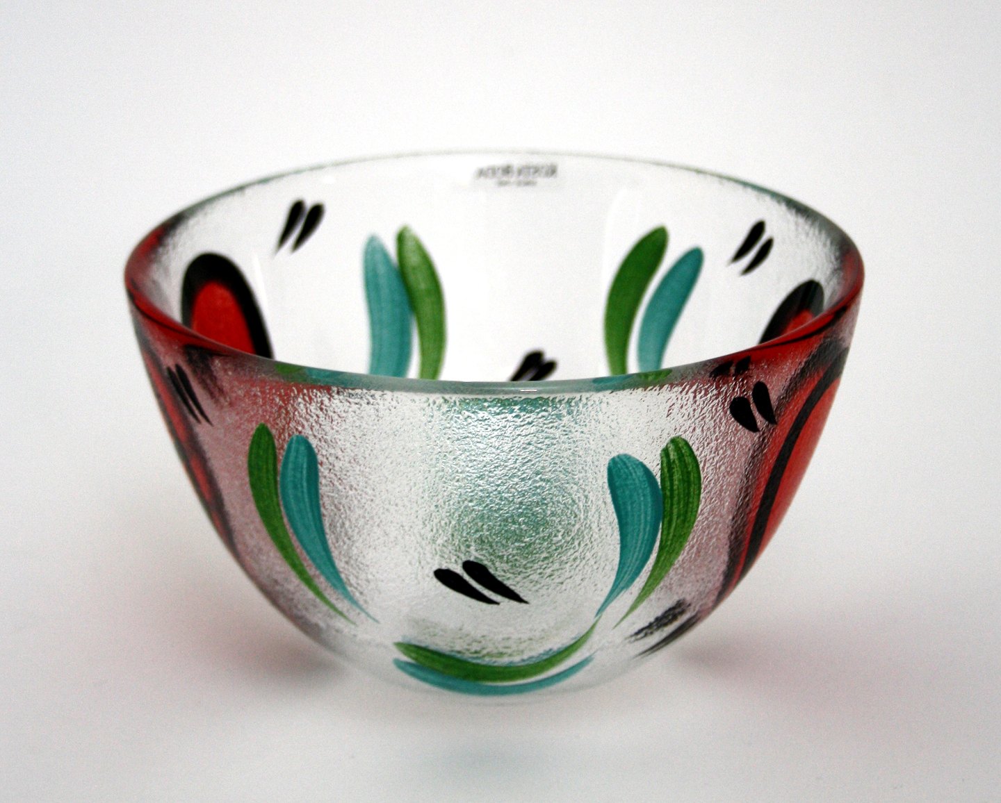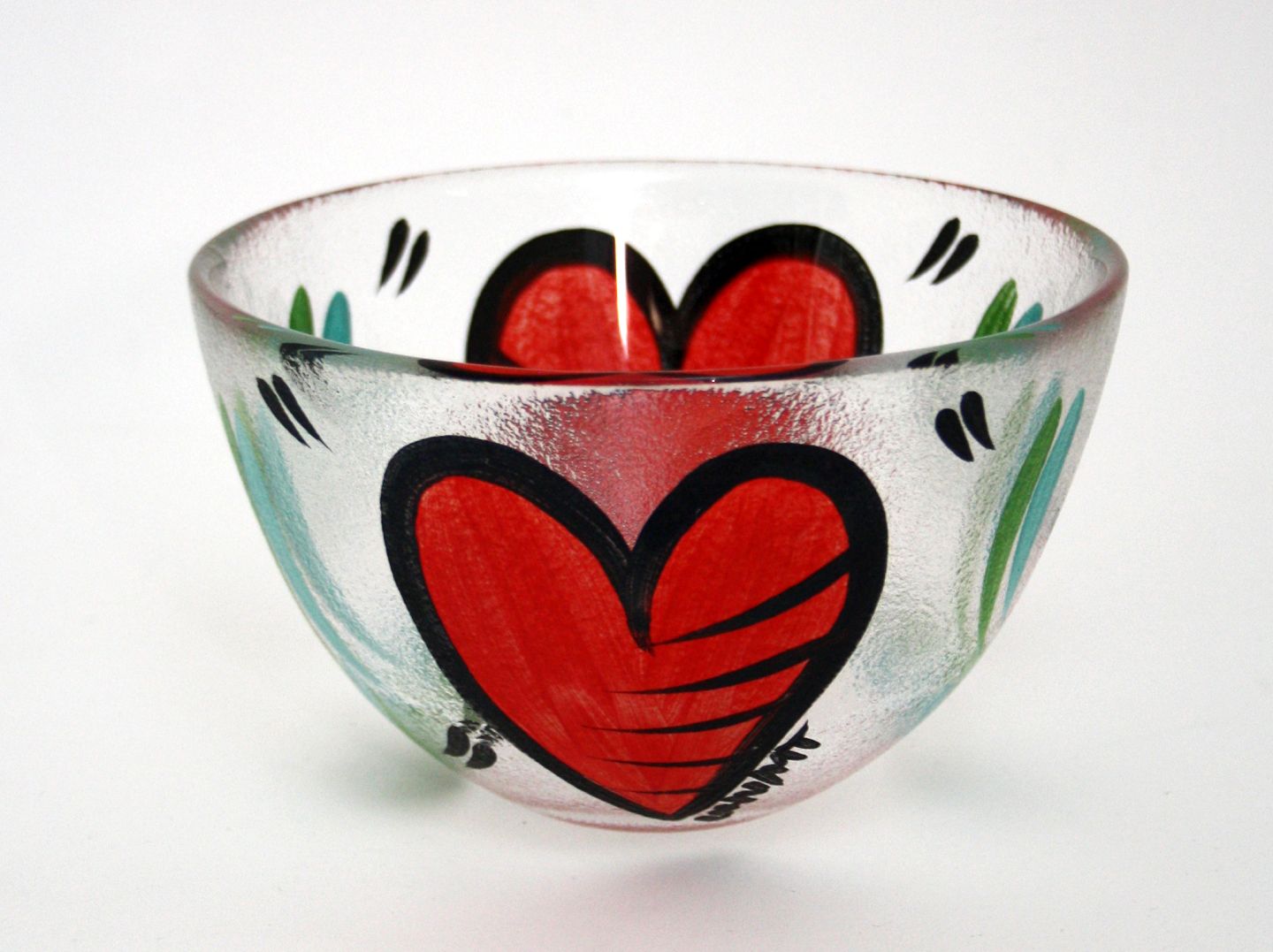 Kosta Boda Sweden, Hearts skål med 2 røde hjerter. Handpainted. Designet af Ulrica Hydman-Vallien i 1995. Højde 9 cm. Øverste diameter 15 cm. Pris: 300 kr.
