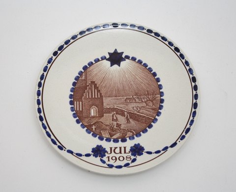 Aluminia, juleplatte 1910. Nr. 765/650. Motiv i relief: 3 engle der ringer med klokker. Designet af Rasmus Harboe. Diameter 30 cm. Højde 3 cm. Flot stand med begrænset overfladekrakelering og glasurafslag på bagsiden. Pris: 975 kr. stk. Lager: 1