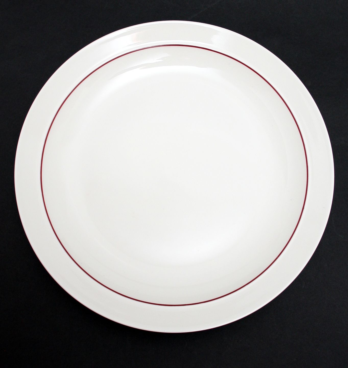Arabia, Finland, Harlekin, rødhat. Creme tallerken med rød indvendig kantstribe. Designet af Inkeri Leivo i 1988. I produktion til 1993.