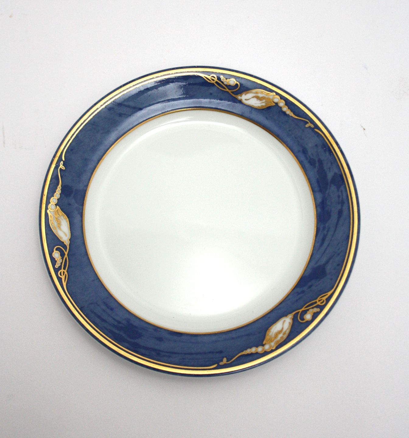 Royal Copenhagen, Blå Magnolia. Blå marmoreret bort dekoreret med gylden blomsterknop. Designet af Flemming Eskildsen. Lille kagetallerken. Diameter 15 cm. Nr. 615. III. sortering, medarbejdersortering. Pris: 40 kr. stk. Lager: 5