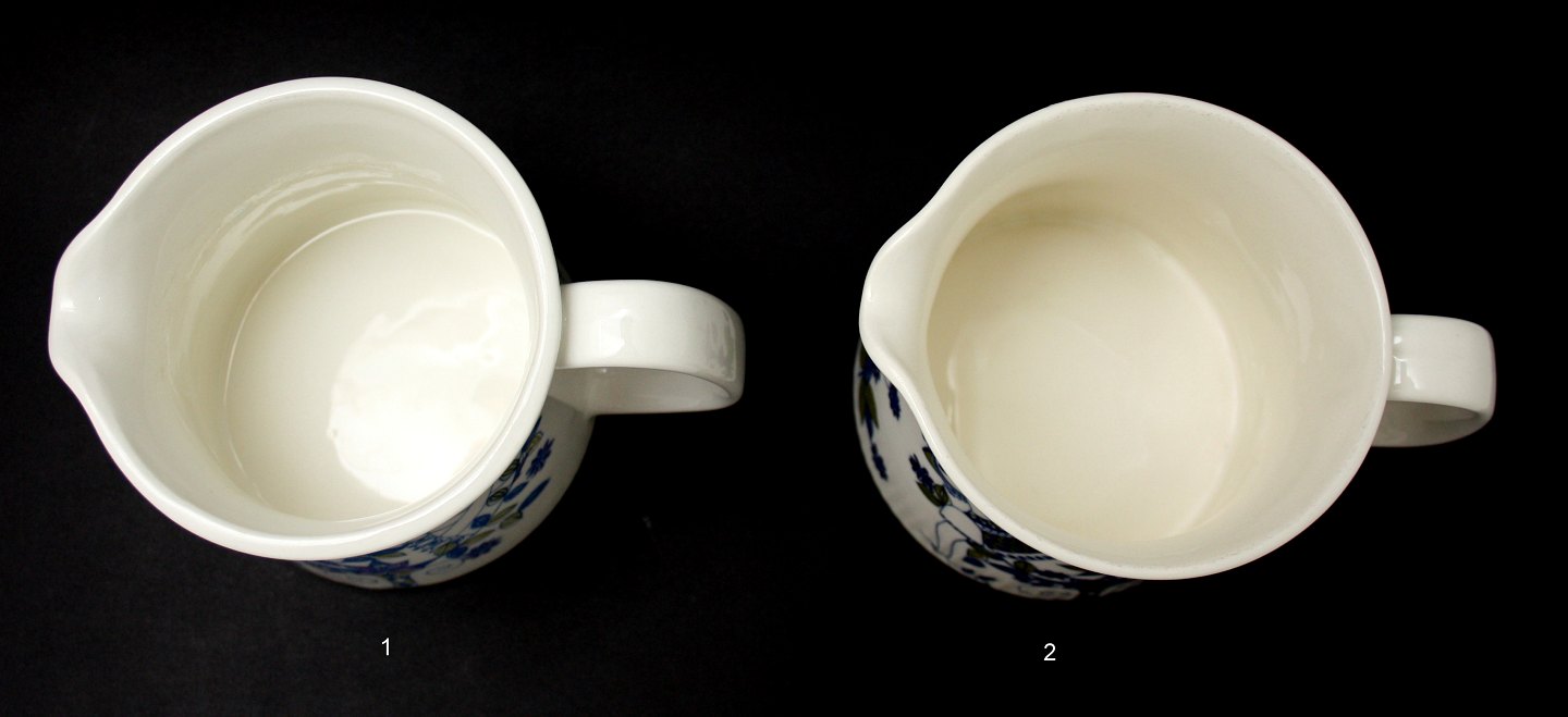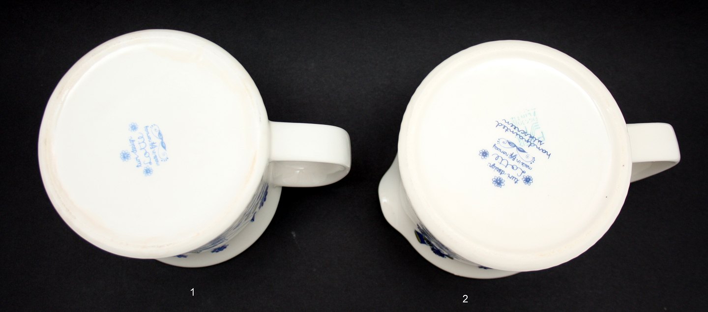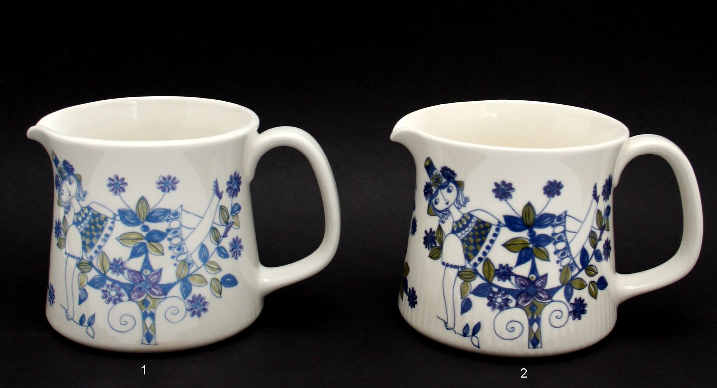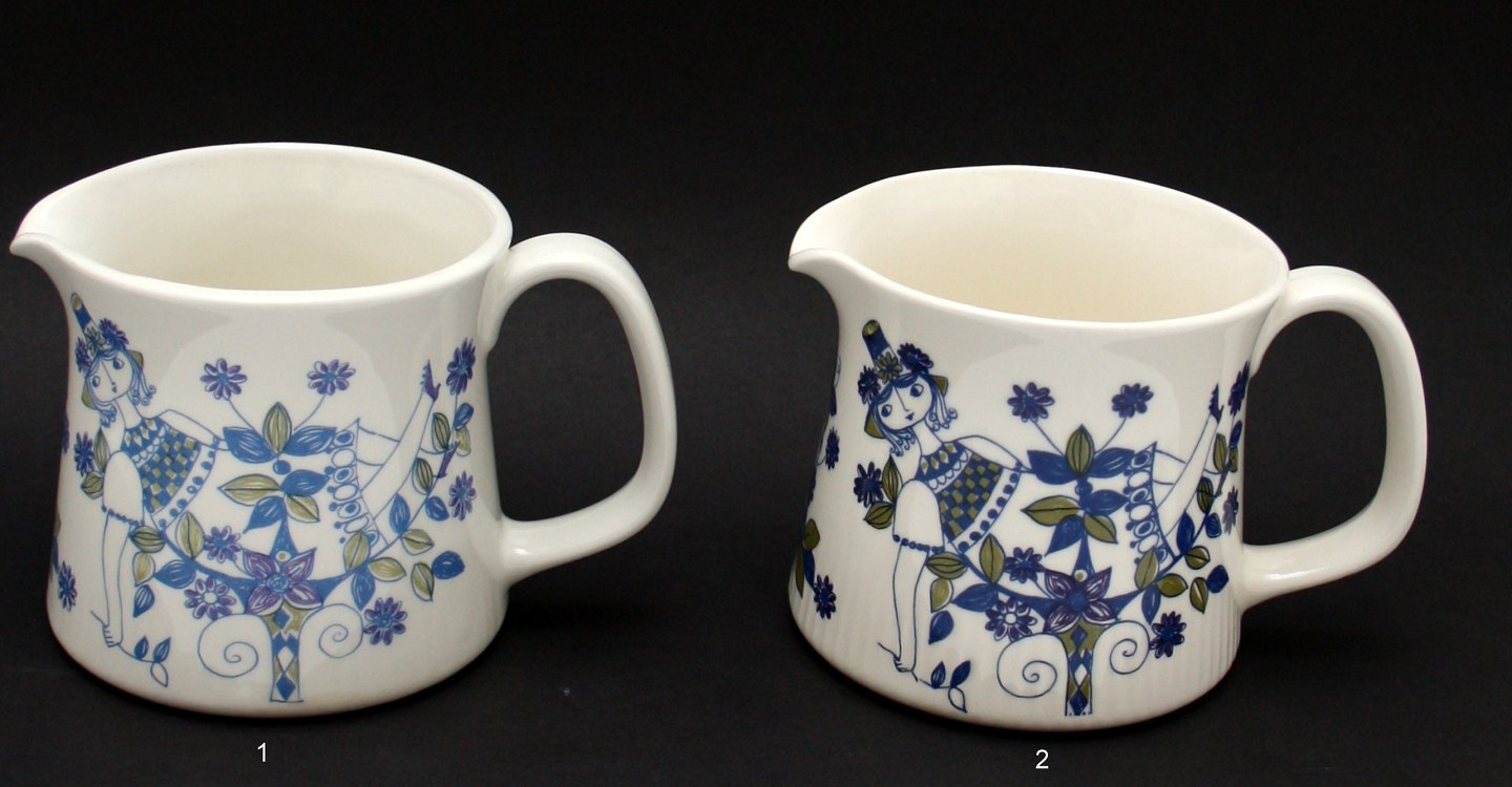 Figgjo Flint, Turi-design, Norway, Lotte. Mælkekande. Designet af Turi Gramstad Oliver. I produktion fra 1962 til 1985. Højde 9,5 cm. Længde 15 cm. Kanderne har forskellig blå farve. Kande 1 og (kande 2 SOLGT). Pris: 250 kr. stk. Lager: 1