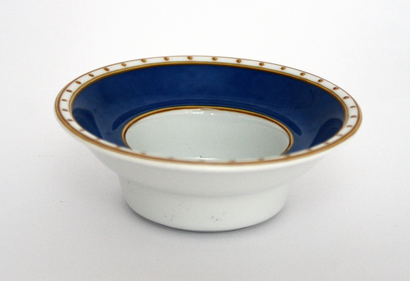 Royal Copenhagen, Ny Liselund. Fyrfadsstage nr. 519. Designet af Diana Holstein i 2001. Mørkeblå med guldkant. Højde 3 cm. Diameter 9 cm. I. sortering. Pris: 125 kr. stk. Lager: 4