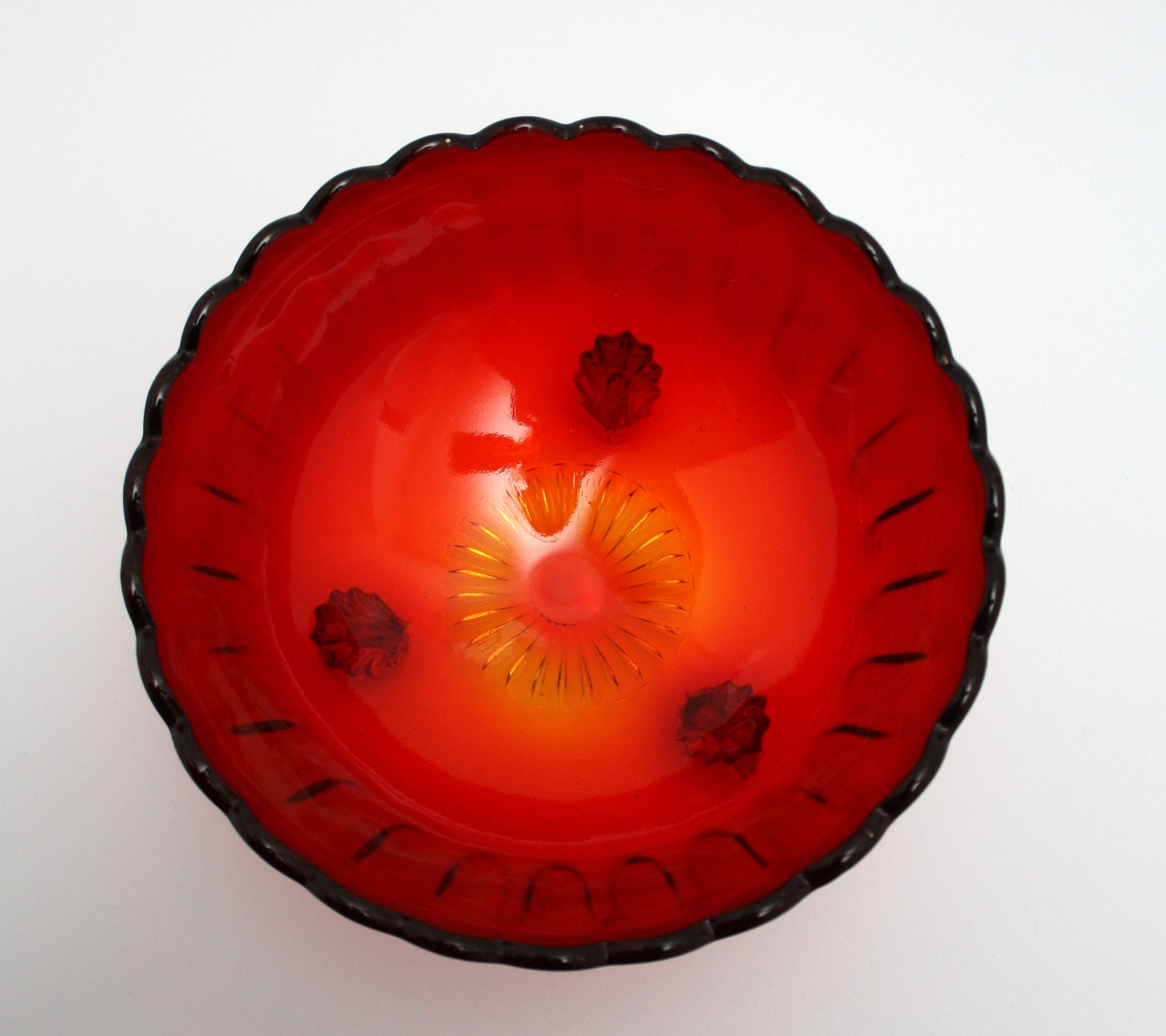 Fyens Glasværk, Rubinrød stor skål på 3 fødder/tæer med orange nuance i presset glas fra 1924. Højde 10 cm. Diameter 21 cm. God stand. Pris: 375 kr. stk. Lager: 2