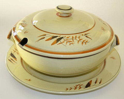 Aluminia, Aakjær dek.nr. 253, håndmalet. Designet af Thorkild Olsen. Produceret i perioden 1934-39. Sovseskål. Længde 22,5 cm. Bredde 15 cm. Højde 9 cm. Små overfladekrakeleringer. Pris: 250 kr. stk. Lager: 1
