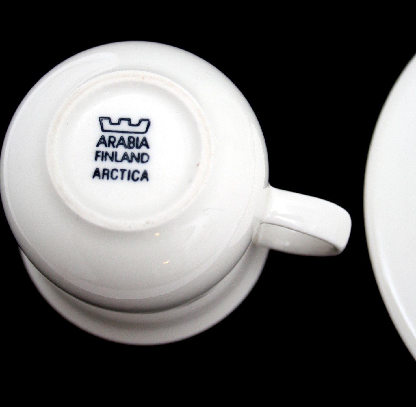 Arabia, Finland, Arctica. Kaffekop med underkop og kagetallerken. Dishwasher & microwave safe. Kop højde 6 cm. Underkop 14 cm. Kagetallerken 16,5 cm. Almindelig brugsslid på kagetallerkenerne. Sælges som sæt på 3 dele. Pris: 100 kr. pr. sæt. Lager: 12 sæt