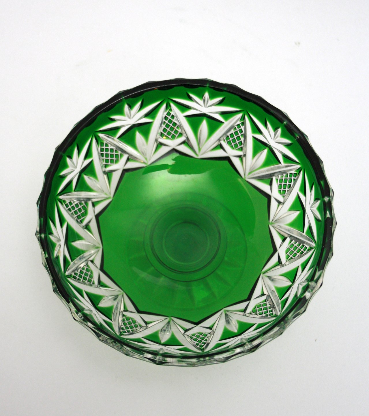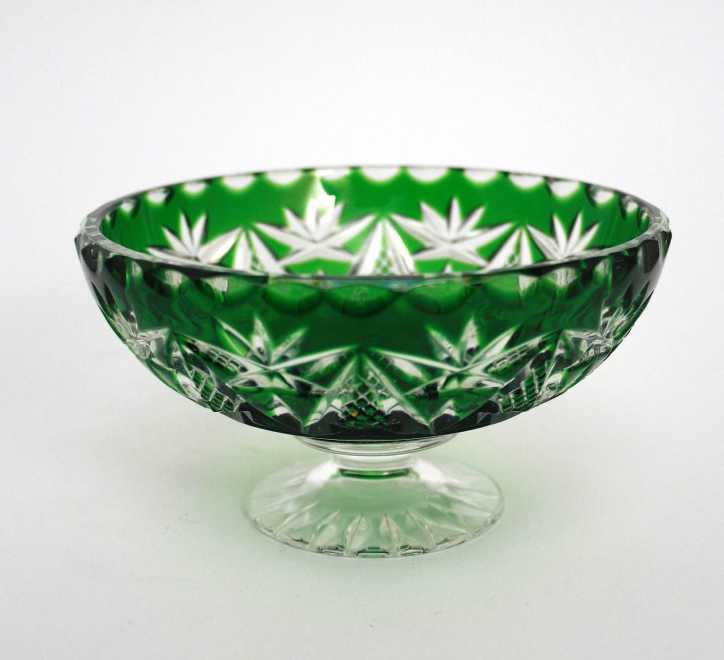 Bøhmisk krystal, smuk grøn skål på fod: Højde 7 cm. Diameter 13 cm. Pris: SOLGT