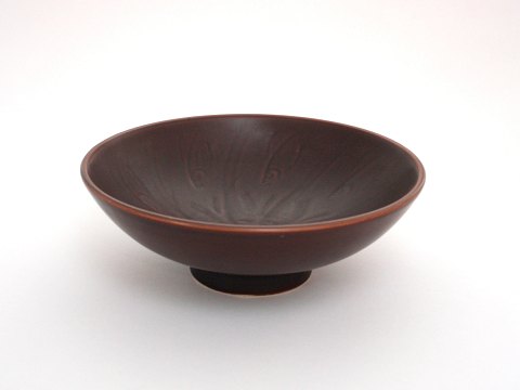 Aluminia, Thule kunstfajance med begittet brun skærv og lyseblå mønster på hvid bund. Designet af Anni Jeppesen i 1962. Cylinderformet vase. Nr. 3174. Højde 11 cm. Diameter 7 cm. Fin stand med en enkelt udvendig glasur revne. Pris: 275 kr.