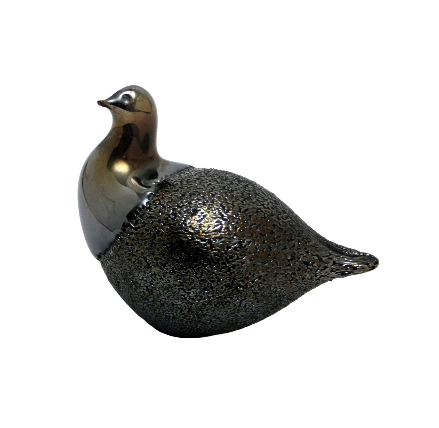 Fugl i sort og sølv designet af Jussi Riihimäki, Finland. Højde 10 cm. Længde 13 cm. Materialet er glas med en tung metallegering udenpå. Pris: 450 kr.