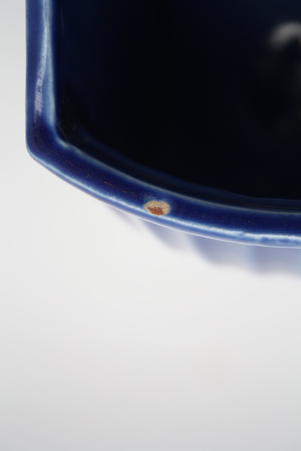 Stor urtepotteskjuler. Højde 18 cm. Bredde 19 cm. Afslag på kant og mikrochip foran. Kalkaflejring indvendig. Pris: SOLGT