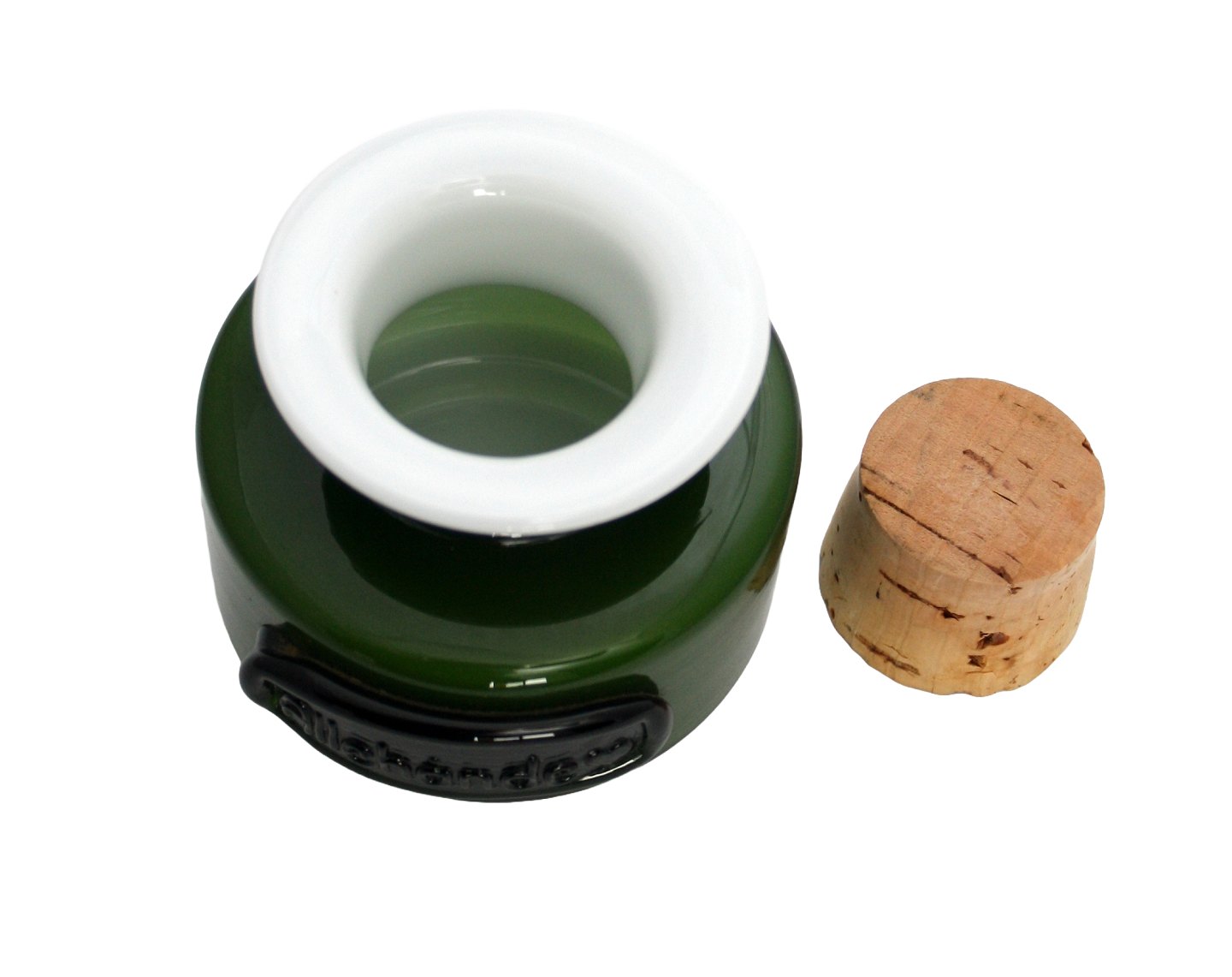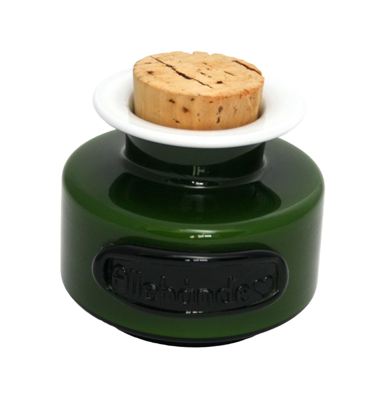 Holmegaard, Palet, Grøn køkkenserie, krydderikrukke med korkprop og etiket med navn efterfulgt af hjerte. Allehånde. Designet af Michael Bang i 1970, udgår i 1976. Højde med prop ca. 8,5 cm. uden prop ca. 6,5 cm. Pris: 225 kr.