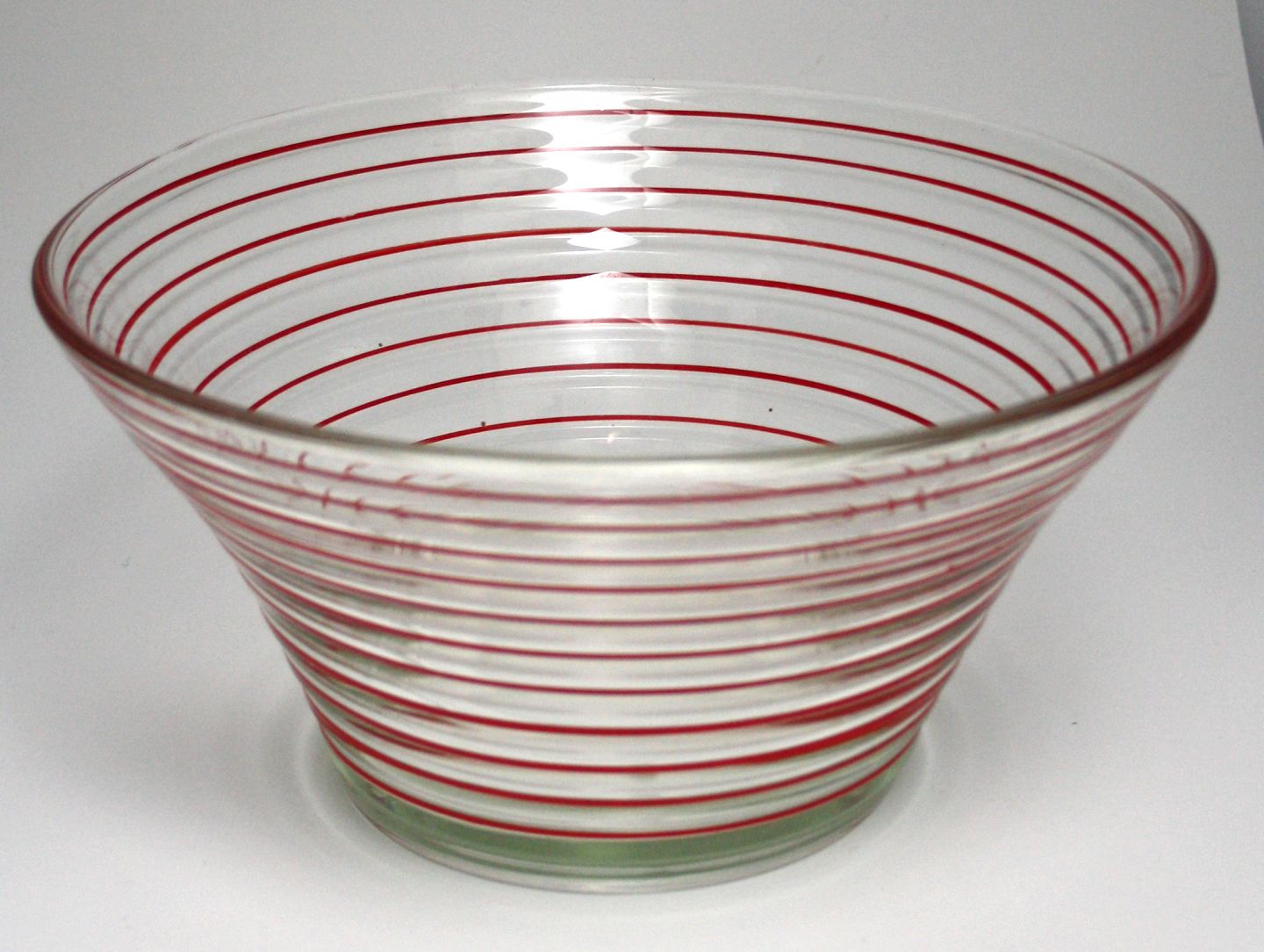 Holmegaard glasværk, Broksø fad, Stor skål, presset glas med røde striber. Designet af Jacob Bang i 1938. Højde 11,5-12 cm. Diameter 23-24 cm. Pris: 225 kr. stk. Lager: 3