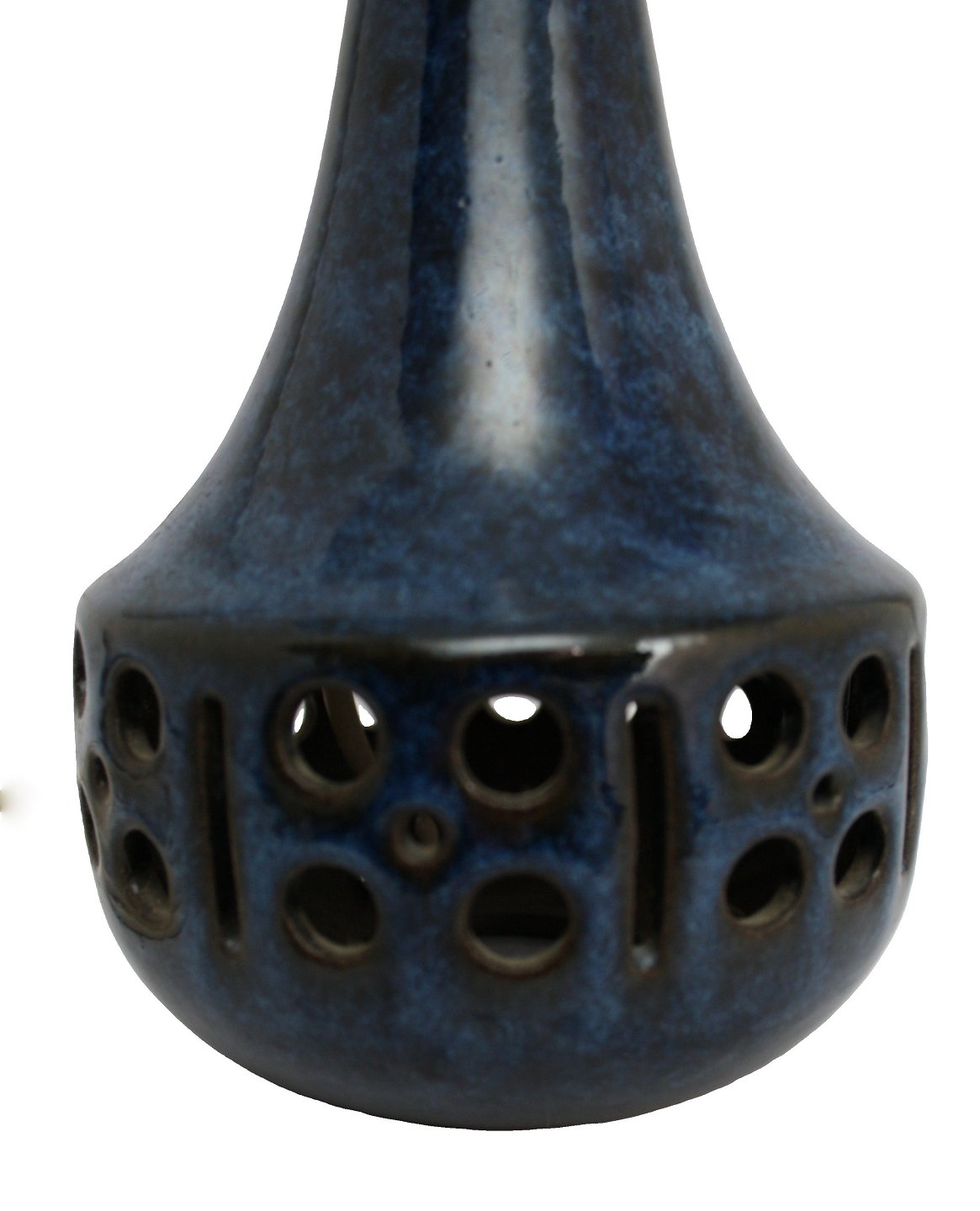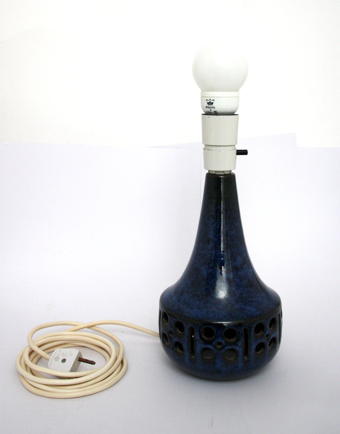 Michael Andersen, Bornholm. Stilren blåglasseret bordlampe med gennemborede huller i lampefod. Designet af Marianne Starck. Nr. 6284. Højde incl. fatning 28 cm. Diameter 13 cm. Fin stand. Pris: SOLGT