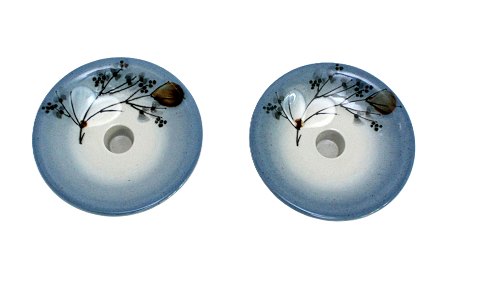 Royal Copenhagen Kunstfajance, Rundt fad med æblemotiver i sort og brun. Nr. 627/3587. Designet af Ellen Malmer. Diameter 19,5 cm. Højde 3 cm. Overfladekrakeleringer. Pris: 350 kr. stk. Lager: 1