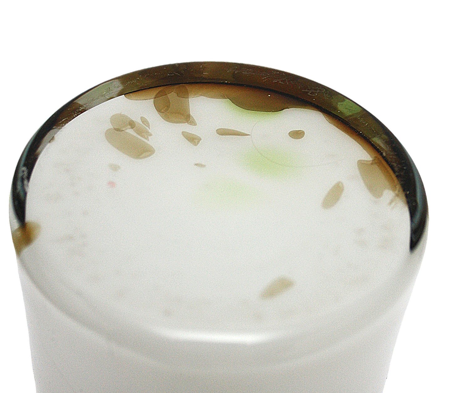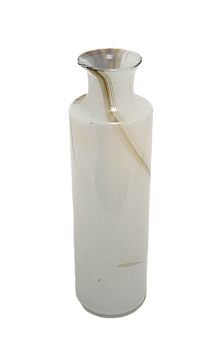 Holmegaard, Najade, Høj slank opalinevase med brune og grønne glasstykker indlagt. Signeret HG PL 2. Højde 28 cm. Diameter 8 cm. 2. sortering fin stand med lidt bølget halsåbning. Pris: 325 kr. stk. Lager: 1
