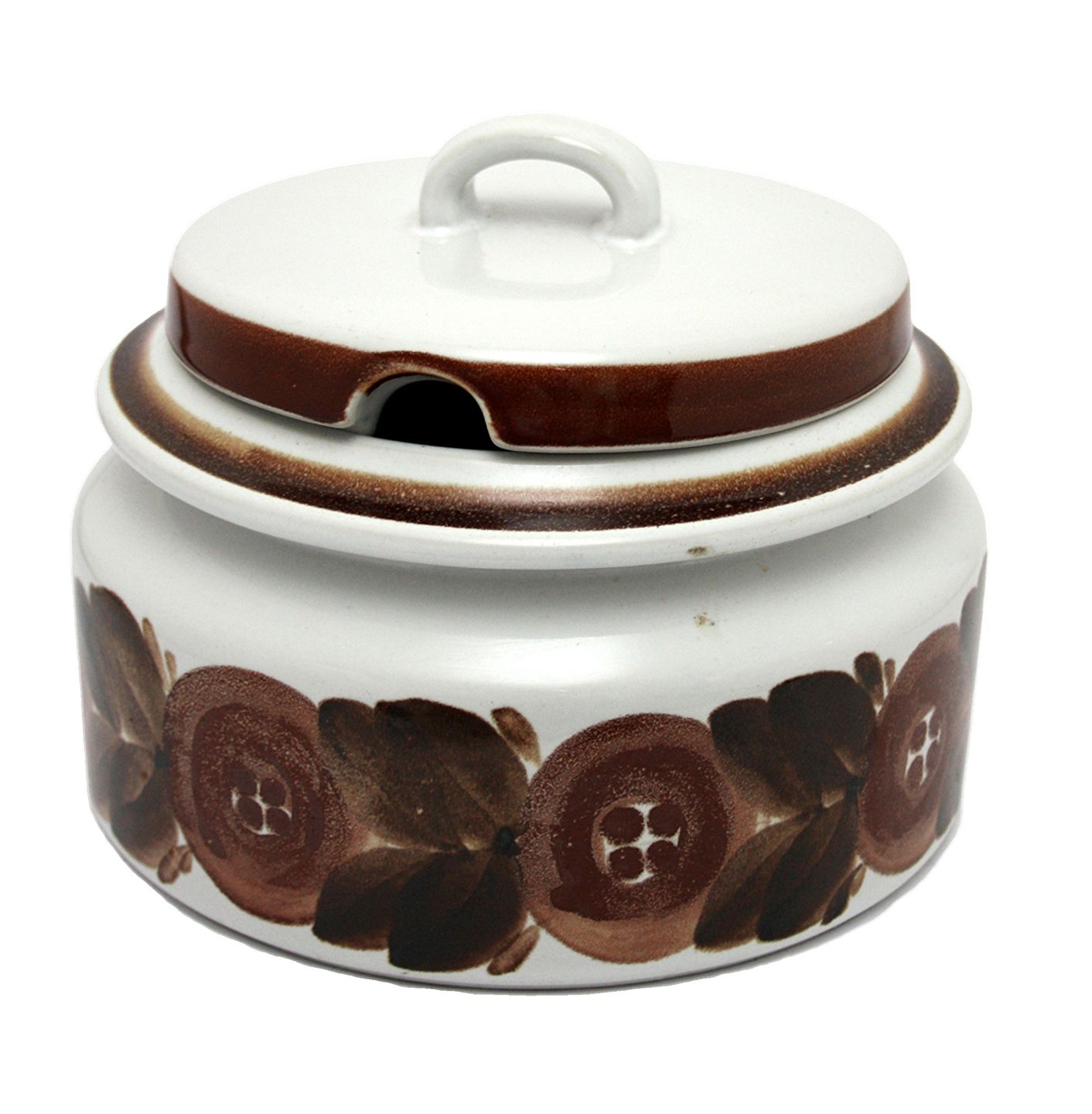 Arabia, Rosmarin, Terrin med låg. Designet af Ulla Procopé i 1961. Fin stand med nogle farvepletter i den hvide glasur. Højde med låg 15,5 cm. Diameter 19 cm. Pris: 395 kr. stk. Lager: 1