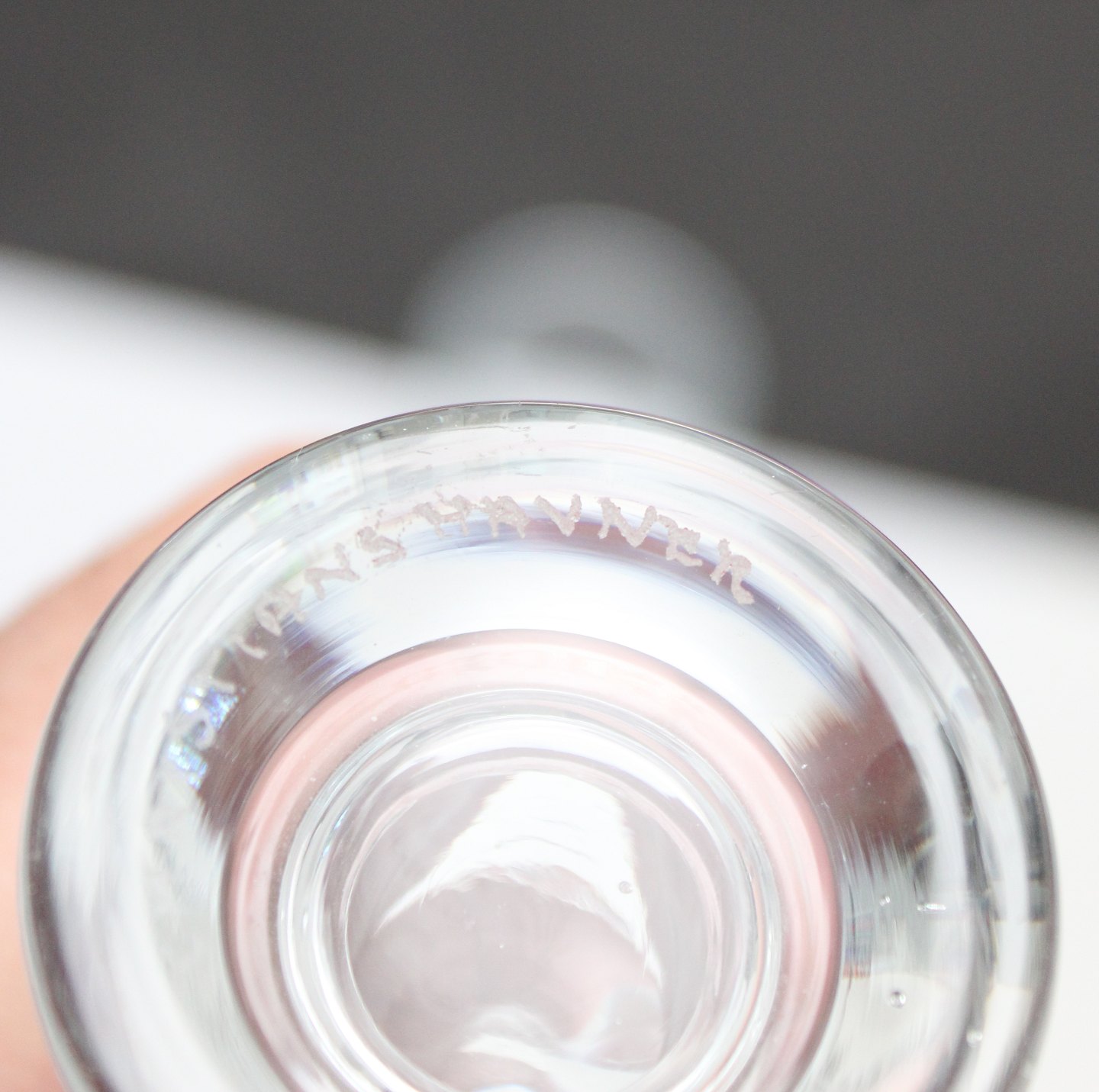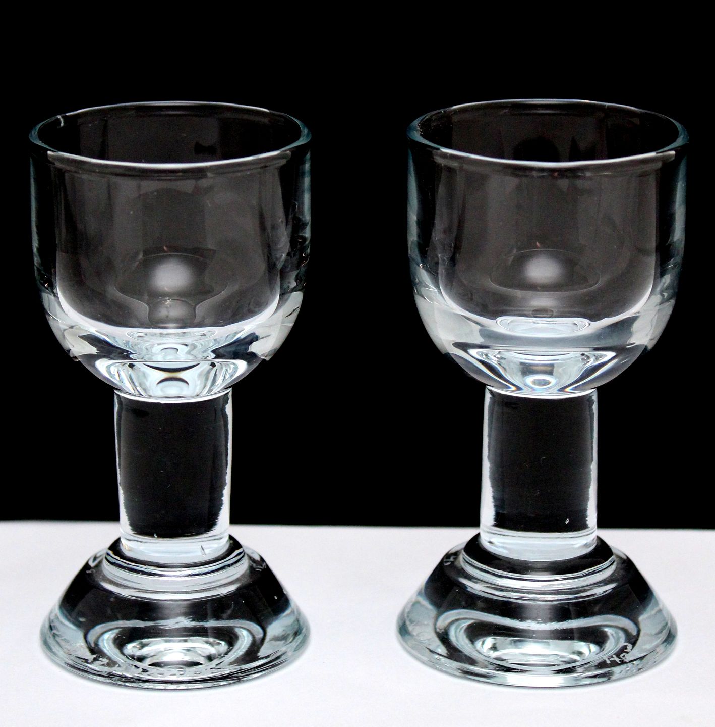 Holmegaard, Christianshavner, Snapseglas. Designet i 1973 af Michael Bang i samarbejde med Peter F Heering og Bent Woldstrup efter model af de gamle jernbaneglas og til Heerings Christianshavnersnaps. Højde 8,6 cm. Øverste diameter 4,5 cm. Enkelte er signeret med HG3, HG4 og enkelte er der indgraveret Christianshavner i bunden. Pris: 75 kr. stk. Lager: 4