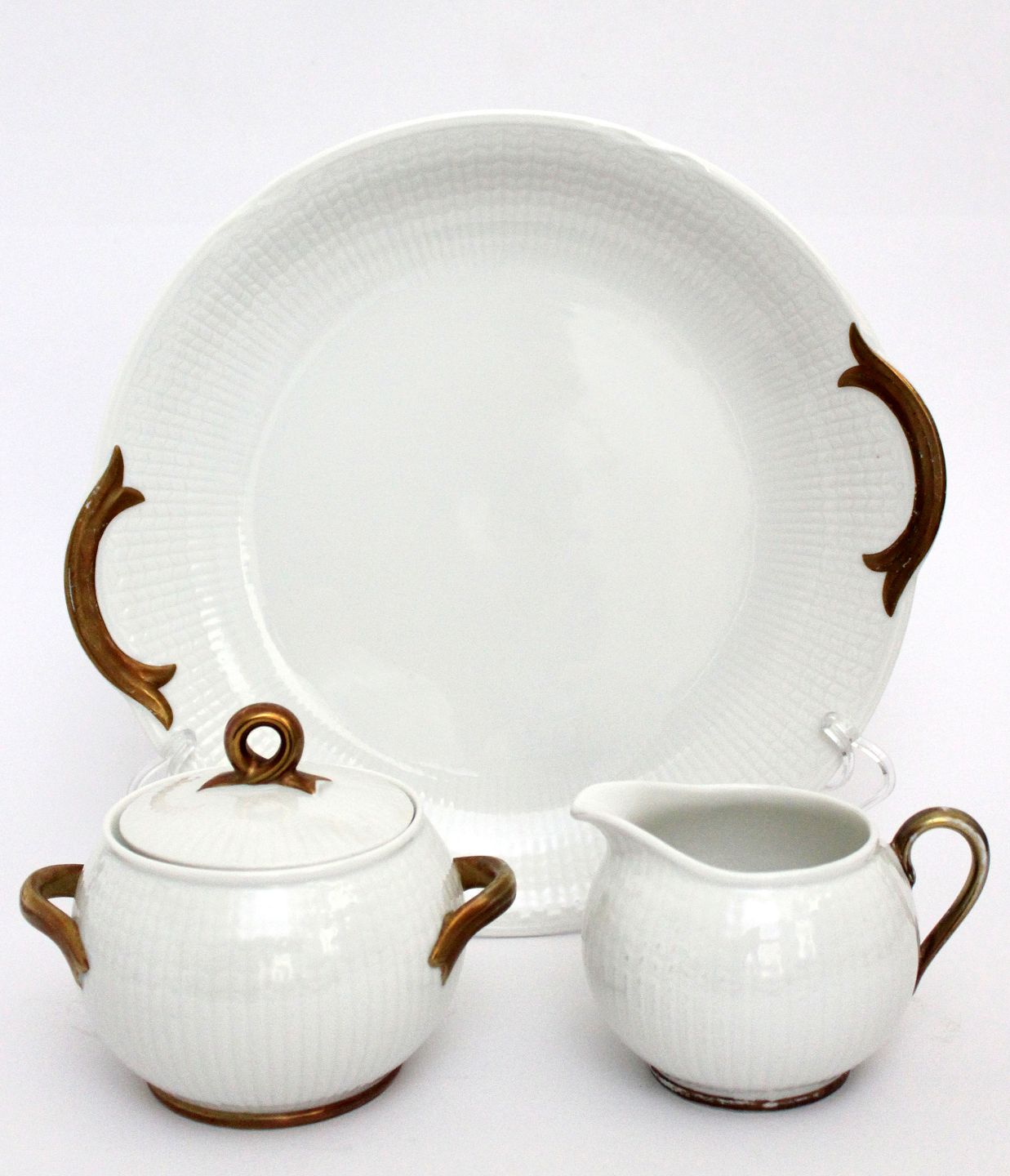Rørstrand, Sweden, Swedish Grace med guld. Sukker og fløde, samt kagefad. Dette stel er kun guldbelagt på ører/hanke og nederste kant. Designet af Louise Adelborg (1915-1971) i 1930, som det store nationale servicestel. Grace stellet produceres endnu.