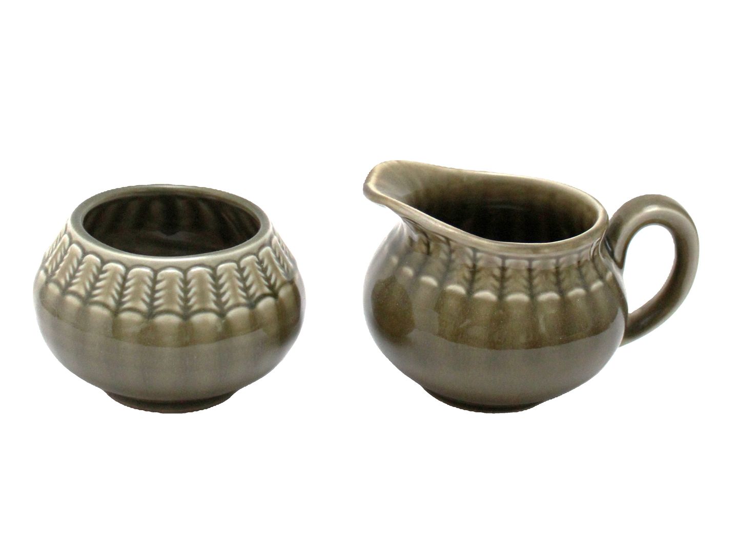 Desiree, Grøn glasseret Sukker og Fløde sæt, som vi desværre ikke kender navnet på, men som er yderst sjælden. Sukkerskål. Højde 6,5 cm. Største diameter 9,5 cm. Flødekande. Højde 7,5 cm. Længde 12,5 cm. Pris: 325 kr. for sæt. Lager: 1 sæt