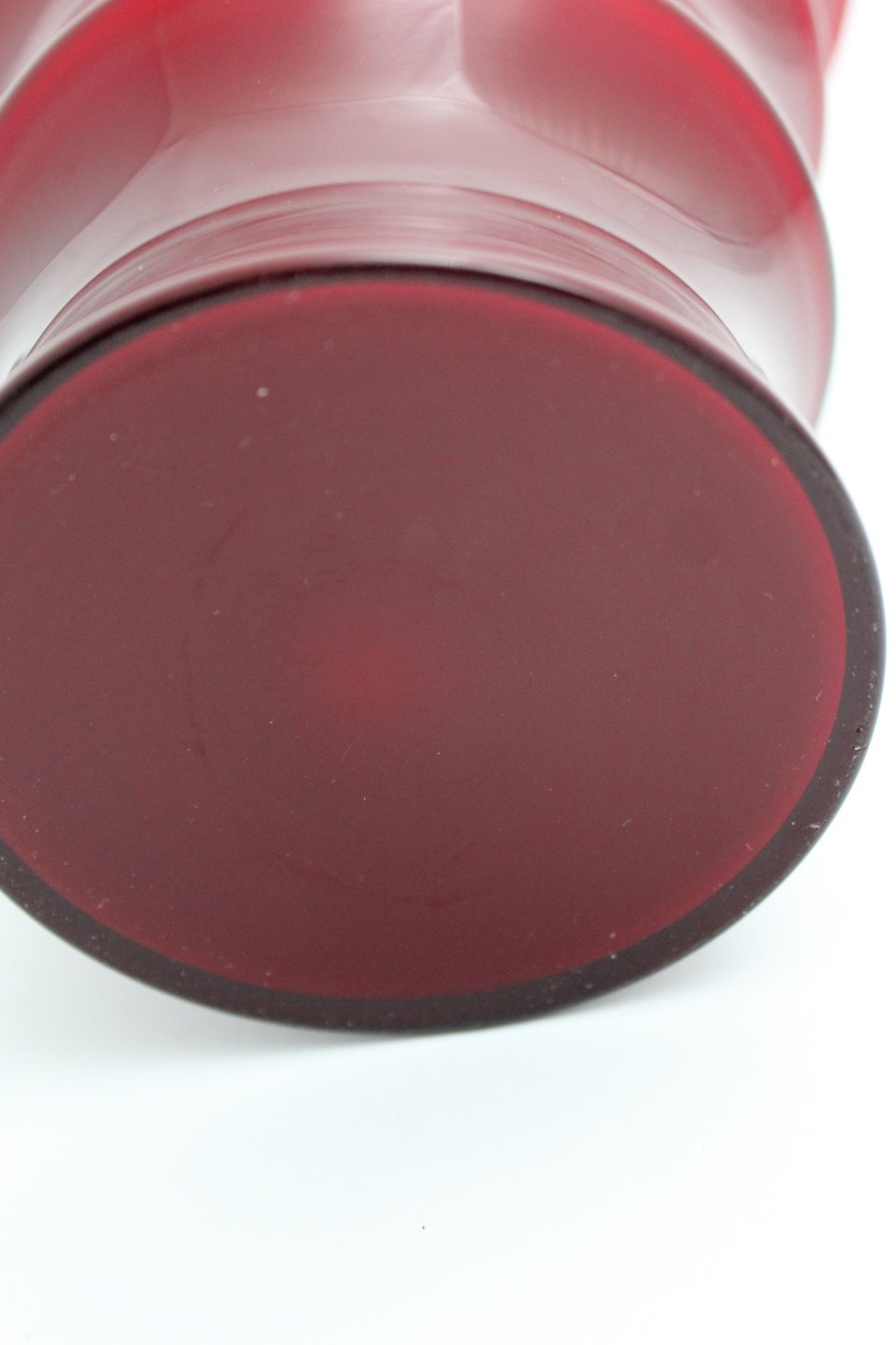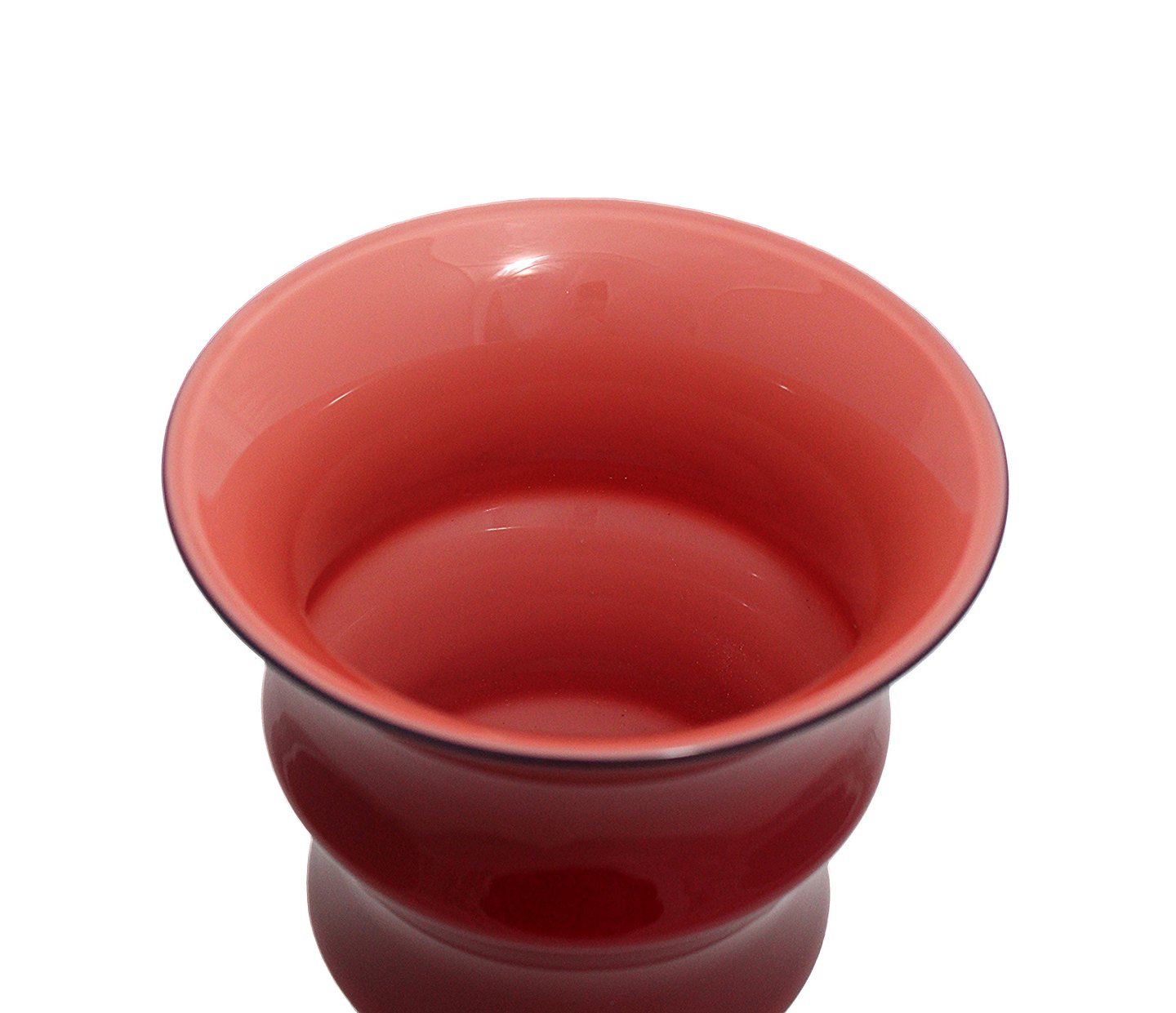 Holmegaard, Karen Blixen rød vase, støvet rosa indvendig. Designet af Anja Kjær fra 2000. Signeret. Vasens form er inspireret af afrikanske kvinders hals og armringe. Højde 17 cm. Diameter 14 cm. Pris: SOLGT