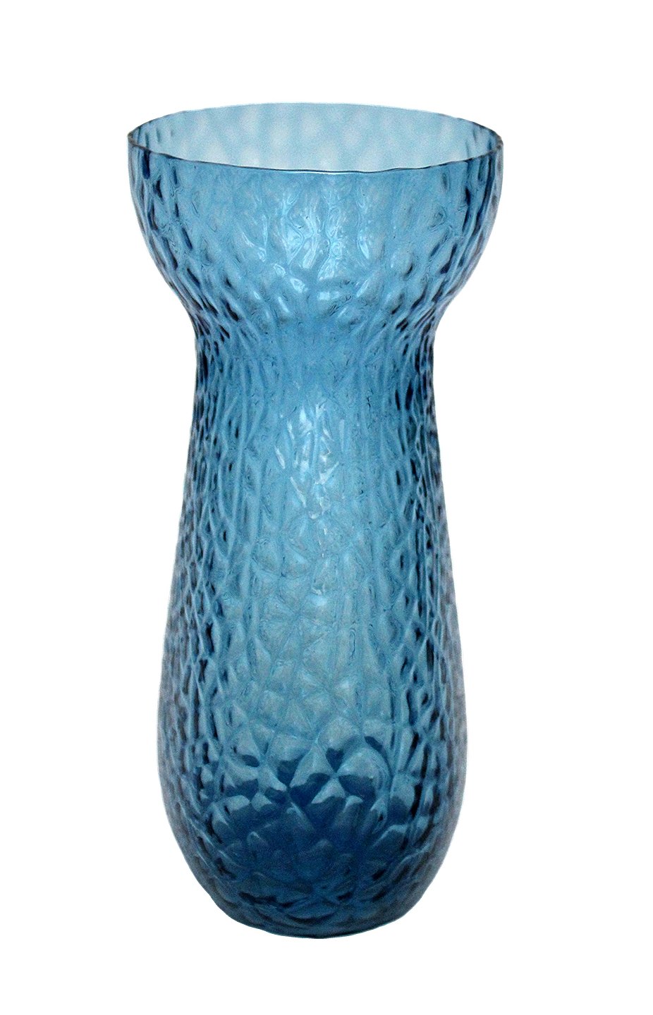 Fyens Glasværk/Kastrup Glasværk, "Blomsterløg", Hyacinth glas/vase i støvet blå presset glas, oval og let optik "net" mønster. Fra 1960. Højde 14,5 cm. Øverste diameter 6,8 cm. Pris: 300 kr. stk. Lager: 1