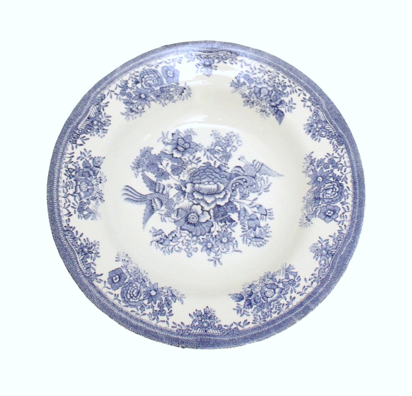 Egersund, Norway, Blå Fasan. Dyb middagstallerken. Fajancestel med blomster og 2 fasaner. Der er farveforskel og forskellige stempler alt efter, hvornår de er produceret. Diameter 22 cm. Højde 3,5 cm. Almindeligt brugsslid, men ingen krakeleringer. Pris: 75 kr. stk. Lager: 2