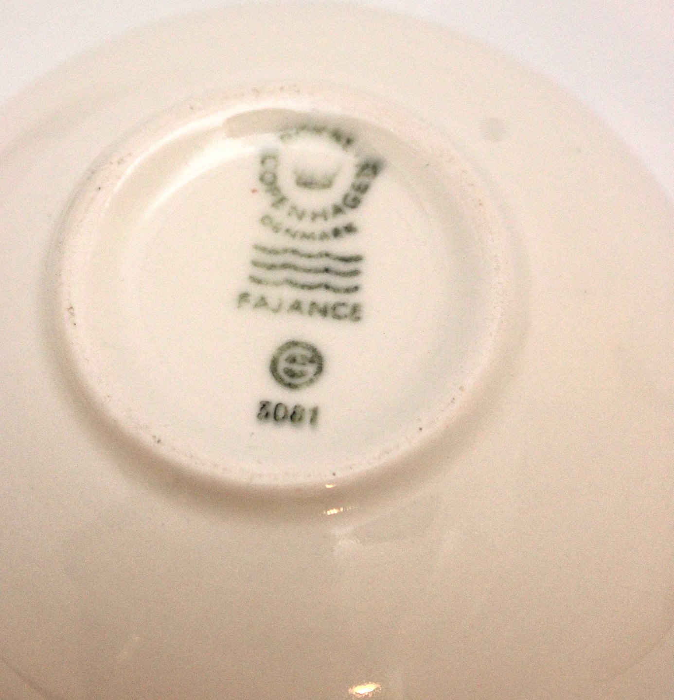 Boullionkop Nr. 3081. Højde 6,5 cm. Diameter 11 cm. Underkop. Nr. 3081. Diameter 17 cm. II/III. sortering. Fin stand med overfladekrakeleringer på ørerne. Pris: 275 kr. stk. Lager: 4