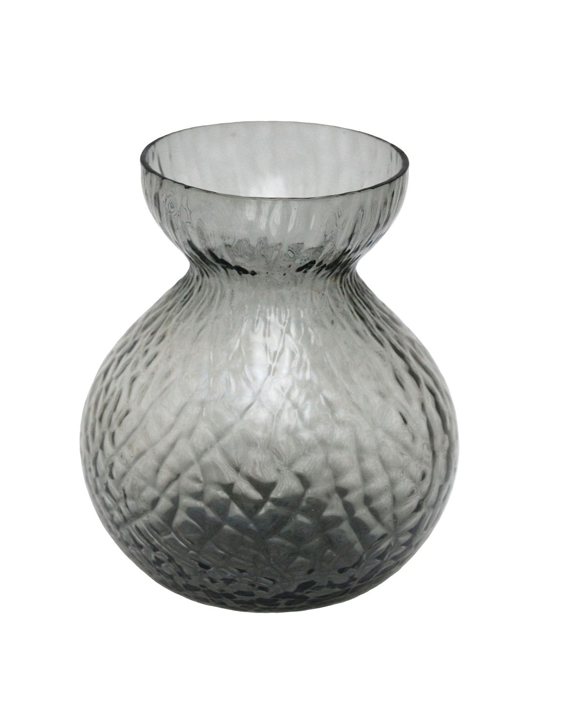 Fyens Glasværk, Dråbeformet blomsterløg, hyacinth glas/vase "net" mønster i maskinblæst presset støvgrå glas. Fra 1960'erne. Højde 11,5 cm. Øverste diameter 7 cm. Største diameter ca. 9,5 cm. Pris: SOLGT