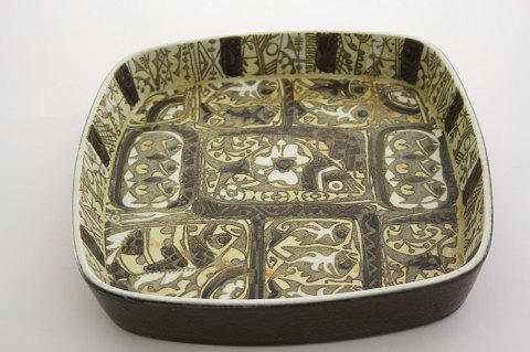 Royal Copenhagen, Baca Kunstfajance firkantet lille vase i brun og gylden glasur med Fiskemotiver på alle 4 sider. Designet af Nils Thorson. Nr. 719/3207. Højde 13 cm. Længde 10 cm. Bredde 6,5 cm. Top diameter 4,5 cm. II. sortering. Pris: 300 kr.