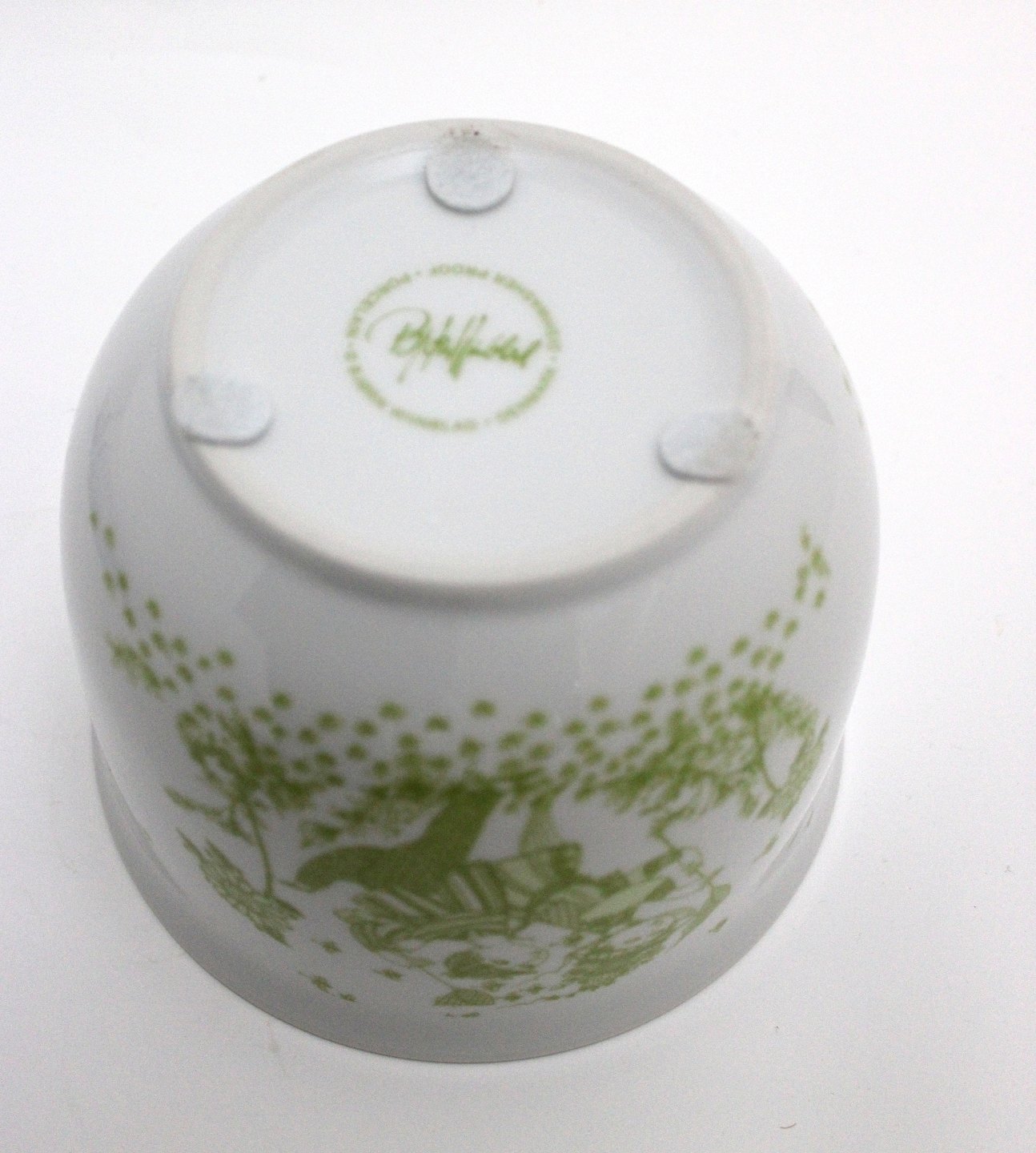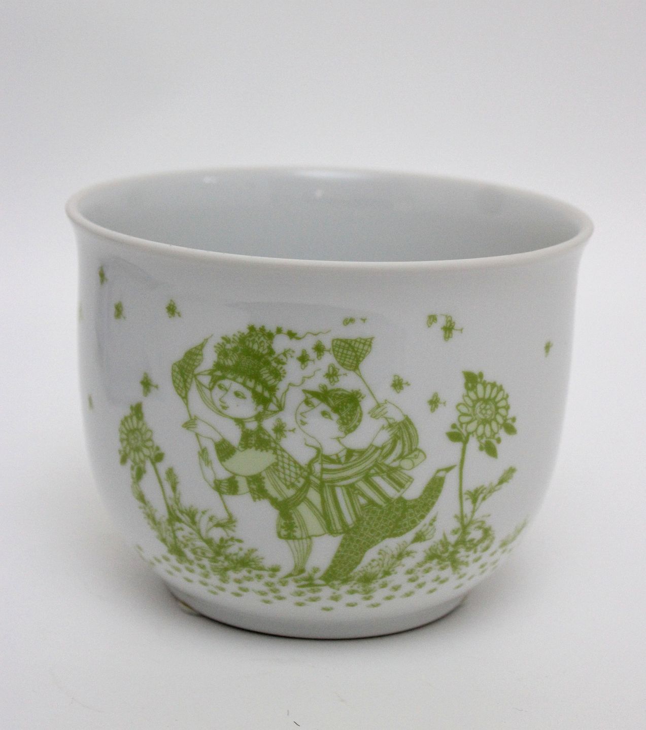 Bjørn Wiinblad, Urtepotteskjuler med limegrønt motiv med et par der fanger sommerfugle. Nyproduceret. Dishwasher proof. Højde 12,51 cm. Øverste diameter 16 cm. Pris: 275 kr.