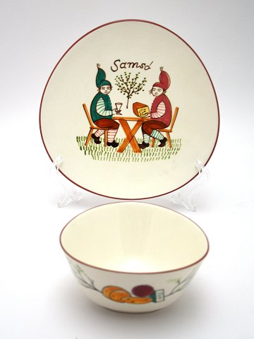 Knabstrup, Ostestellet. Formgivet af Johannes Hansen i 1959 og dekoreret af Paul Høyrup. Motiv og navn for de forskellige danske ostetyper, Fynbo, Molbo, Danbo, Maribo, Esrum og Samsø.