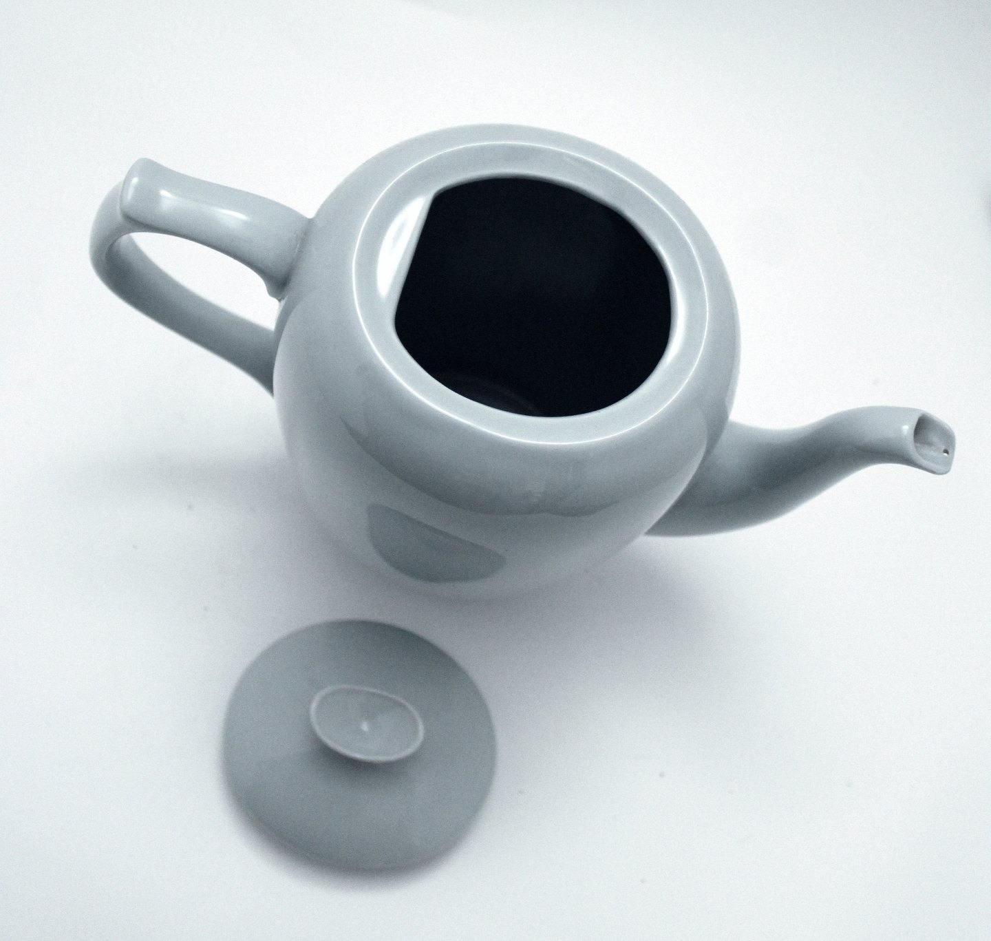 Bing & Grøndahl, Leda, Sart lysegrå/lyseblå stel. Kaffekande. Farven snyder meget, på billederne ser det lyseblåt ud og alt efter lyset ser det gråt ud. Kaffekande. Nr. 301. Højde 20,5 cm. Længde 22 cm. Bredde 10 cm. Pris: 250 kr.